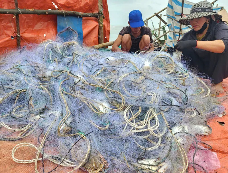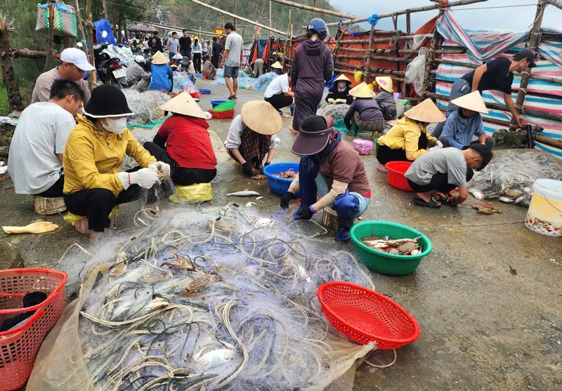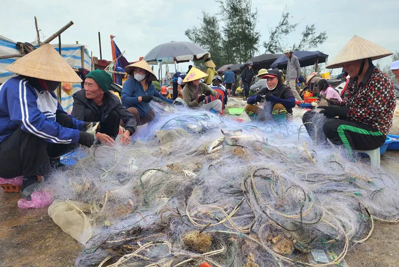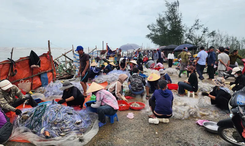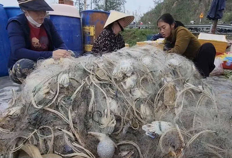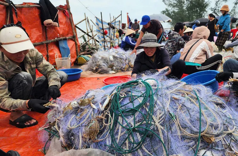 Thuyền cập bến, mọi người tập trung rũ lưới, gỡ bắt ghẹ để đem đi tiêu thụ, tiếng nói cười rôm rả xua tan những ngày mưa lũ triền miên, khốn khó.