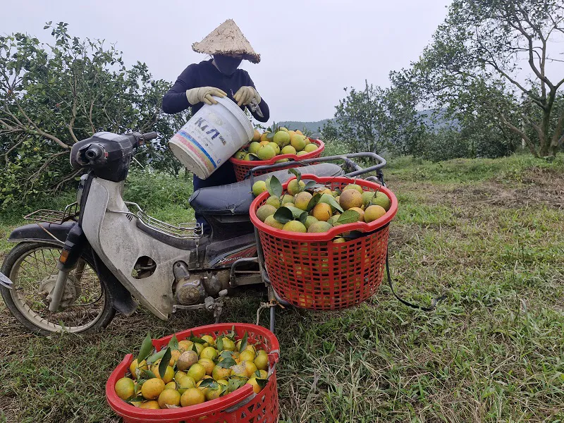 Người dân xã Mai Hoa, tỉnh Hà Tinh tập trung thu hoạch cam bán ra thị trường.
