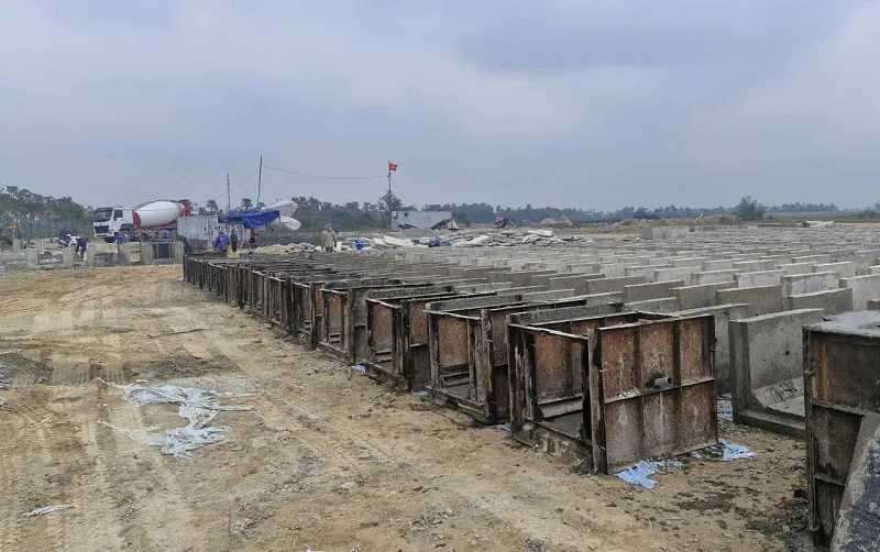 Đơn vị thi công tập trung đúc cấu kiện bê tông phục vụ xây dựng hệ thống thoát nước tại dự án hạ tầng khu tái định cư Tổ dân phố Liên Vinh