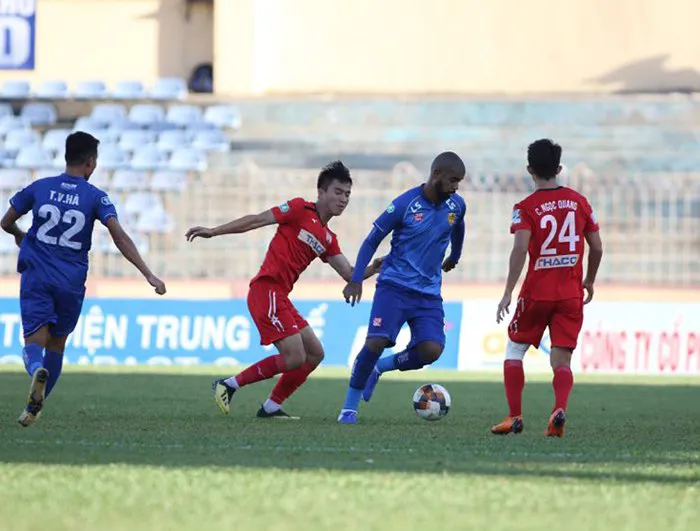 | HAGL gục ngã trên chấm 11m trước Quảng Nam. Ảnh: Viết Định |