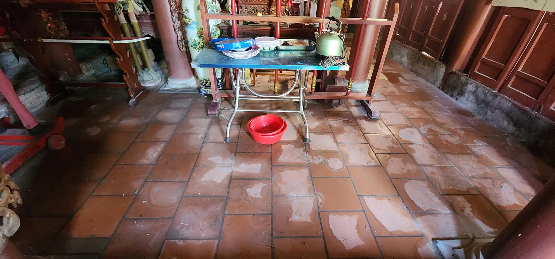 Mưa xuống trong miếu bị dột không khác ngoài sân. Ảnh: Vĩnh Quân