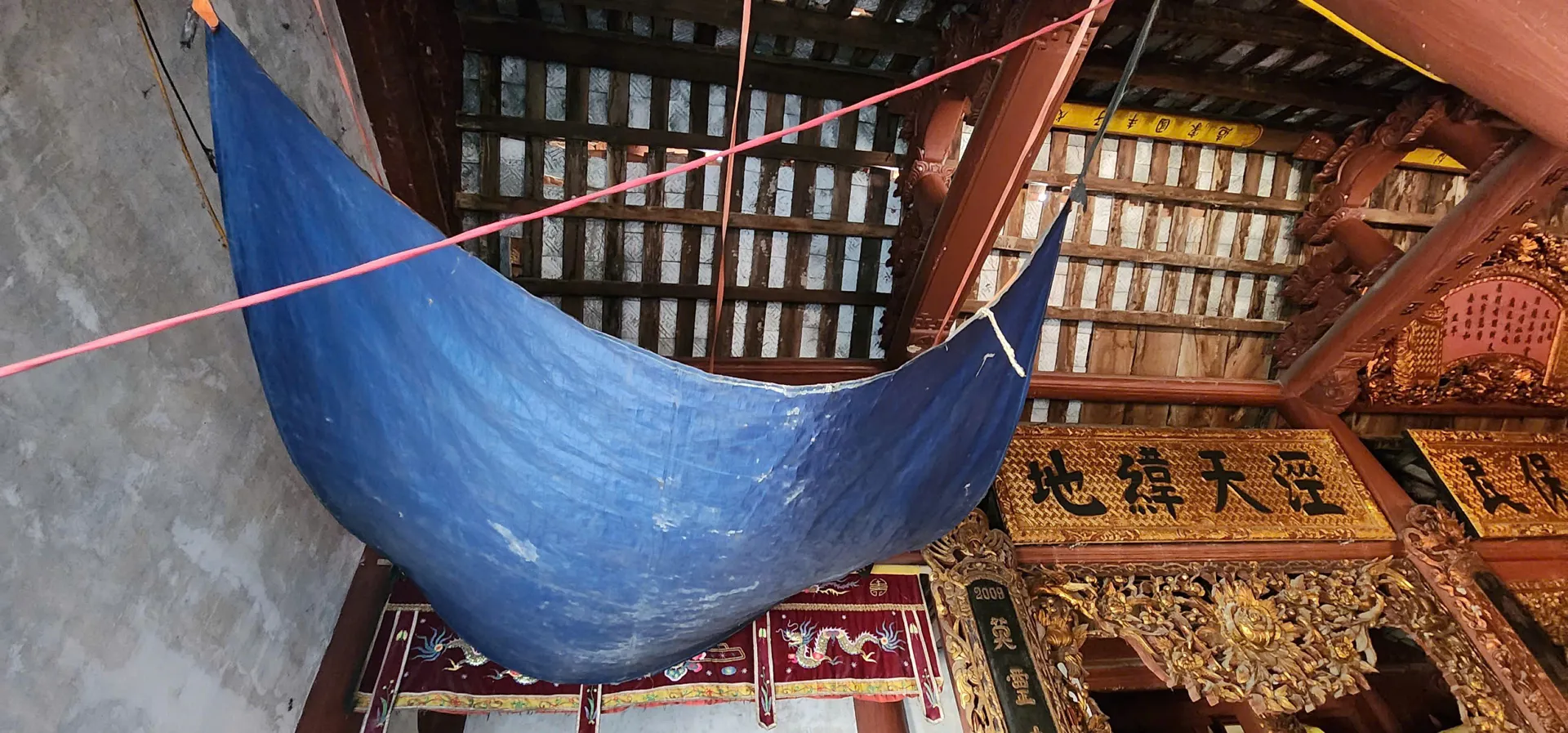 Người dân giăng bạt để bảo vệ miếu khi trời mưa. Ảnh: Tiến Bảo