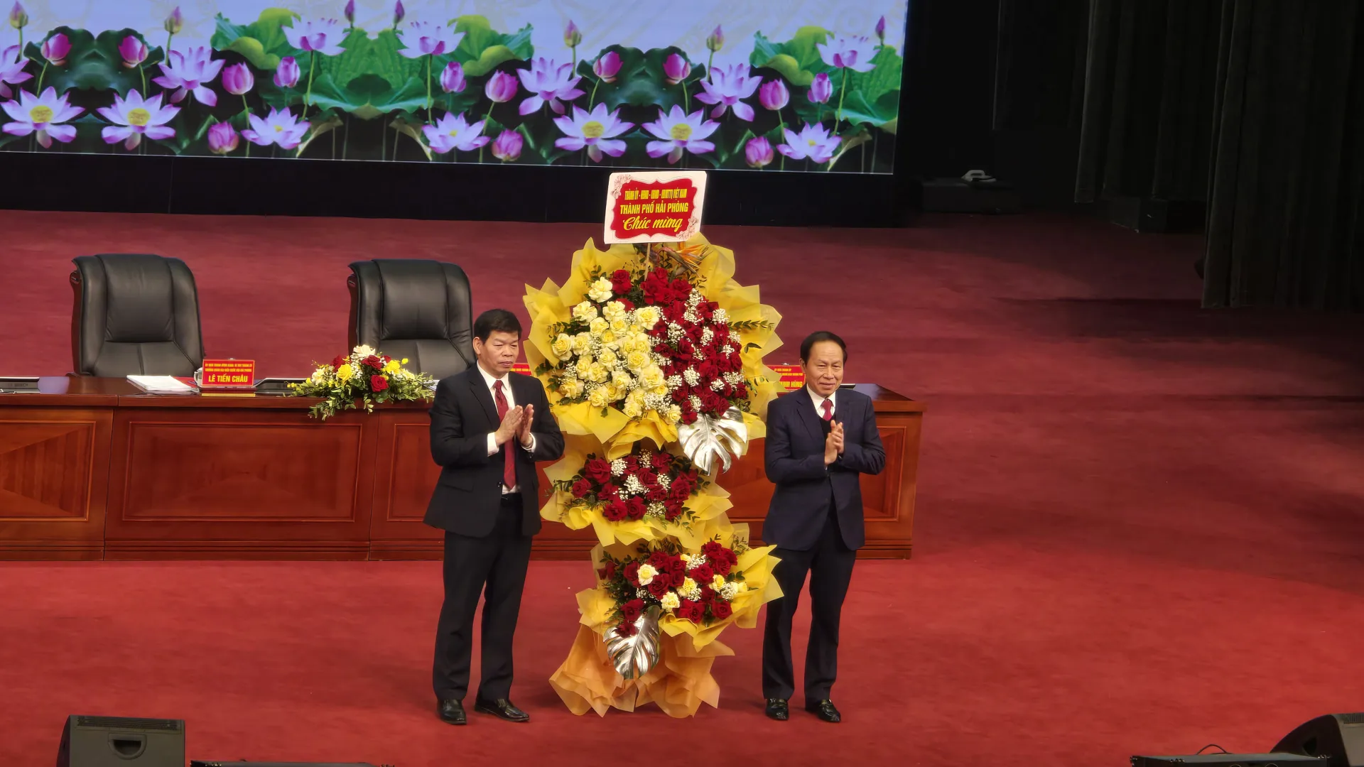 Bí thư Thành uỷ Hải Phòng Lê Tiến Châu trao tặng lẵng hoa tươi thắm cho ông Lương Văn Việt - Giám đốc Sở GD&ĐT Hải Phòng.
