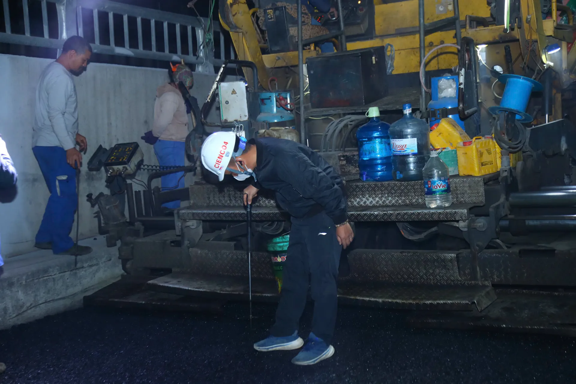 Giám đốc điều hành dự án Hồ Đức Phúc cho biết: “Trong đêm 31/1, chúng tôi tiến hành thảm bê tông nhựa để hoàn thiện phần hầm hở phía Đầm Hồng. Khối lượng thảm lớp C19 trong đêm khoảng 400 tấn. Công việc bắt đầu từ 23 giờ và dự kiến hoàn thành vào khoảng 5 giờ sáng hôm sau”.