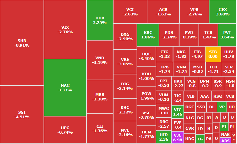 Điểm nhấn của phiên hôm nay là hiện tượng “thị trường giảm nhẹ – cổ phiếu giảm mạnh”, khi hàng loạt cổ phiếu đang quay trở lại vùng đáy tháng 4. Áp lực bán áp đảo diễn ra mạnh nhất tại nhóm chứng khoán và ngân hàng – các trụ đỡ quan trọng của thị trường.