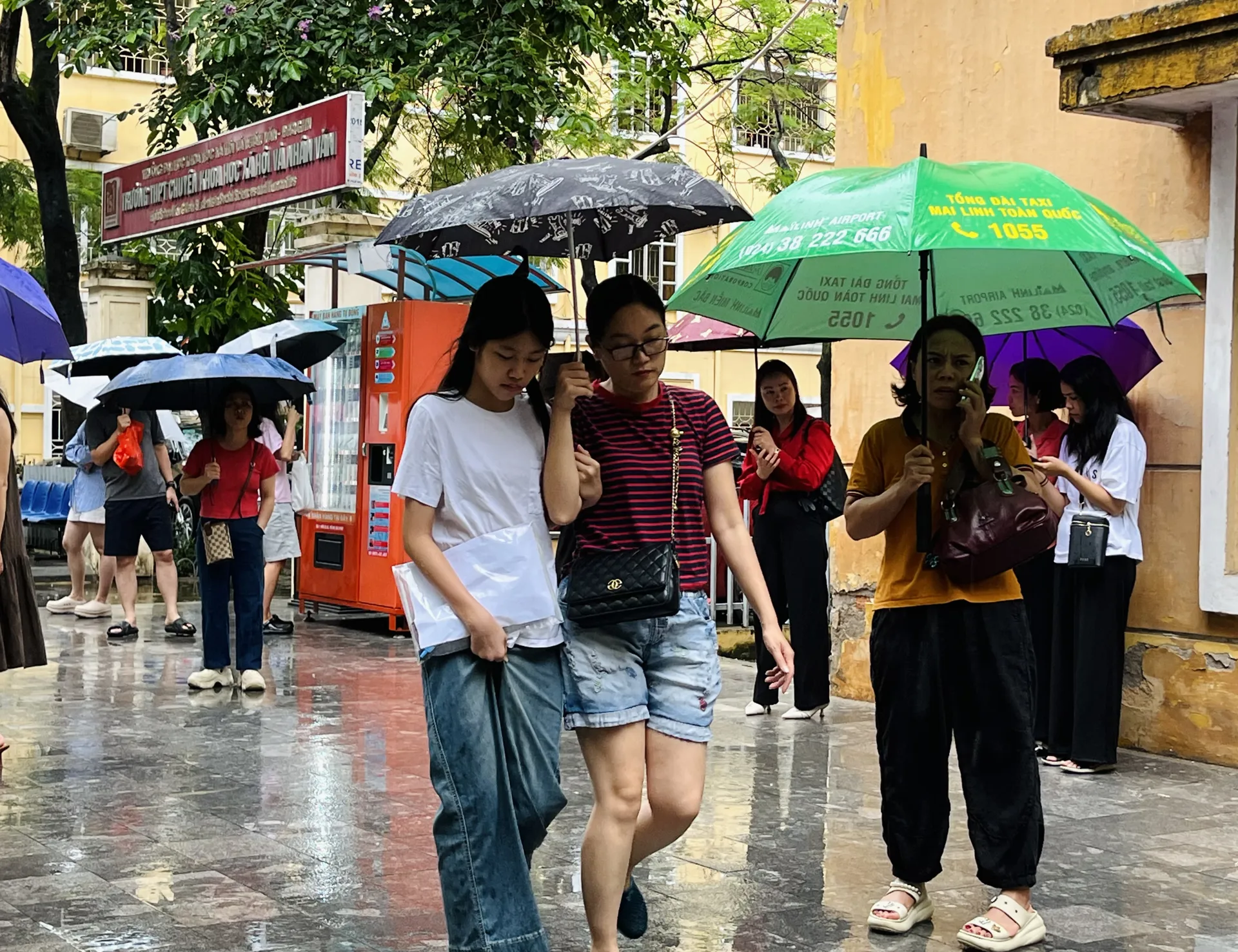 Sáng 24/5, Hà Nội mưa lớn nên việc di chuyển của thí sinh đến điểm thi có nhiều bất tiện. Khu vực cổng - lối vào các điểm thi có lực lượng trật tự, tình nguyện viên chỉ dẫn nhiệt tình.