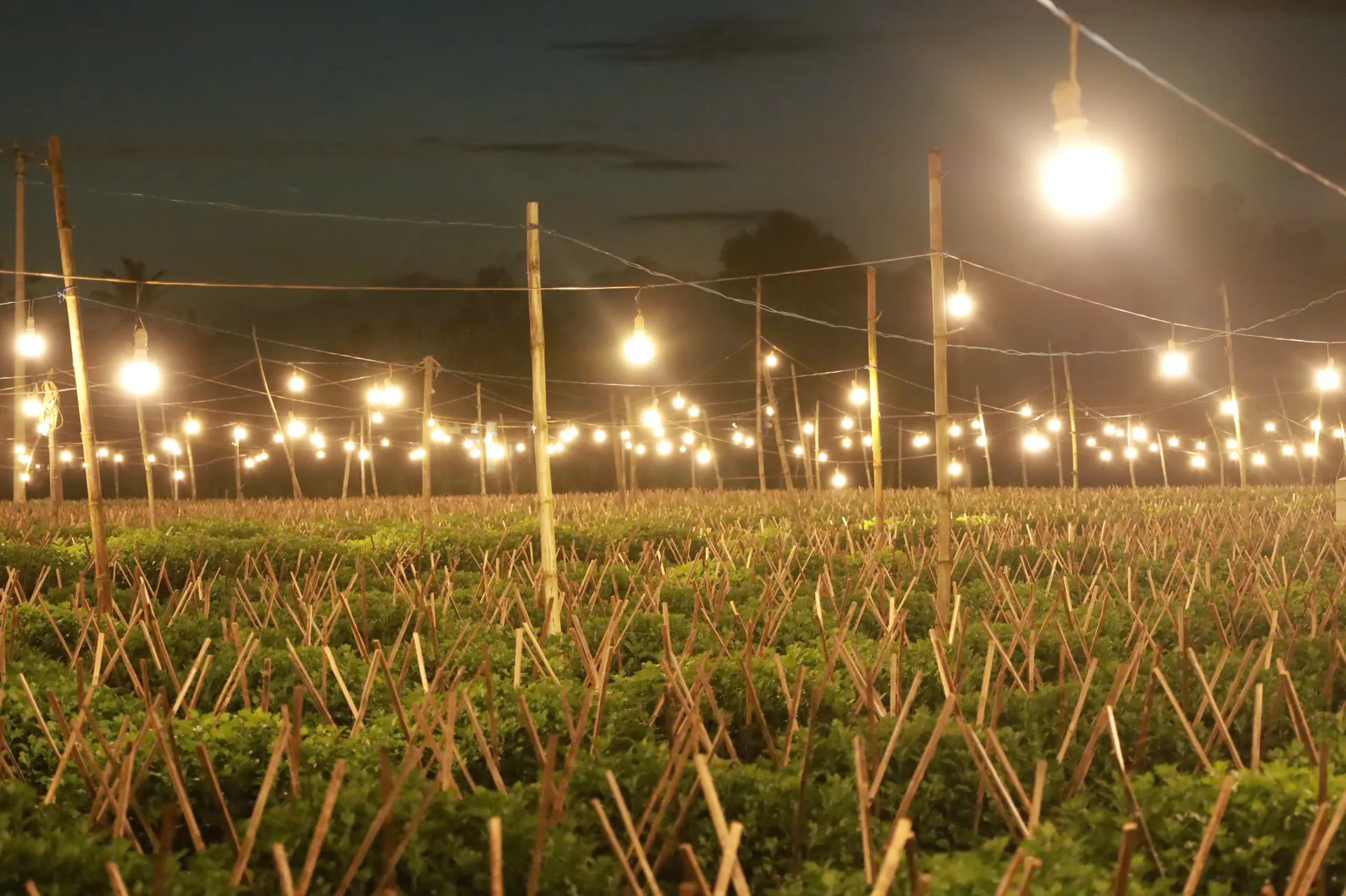 Kinhtedothi-Đến hẹn lại lên, chừng vài tháng trước Tết Nguyên đán, hàng triệu bóng đèn ở làng hoa Nghĩa Hiệp (xã Vệ Giang, tỉnh Quảng Ngãi) lại rực sáng suốt đêm để cúc mau lớn và nở đúng vụ.