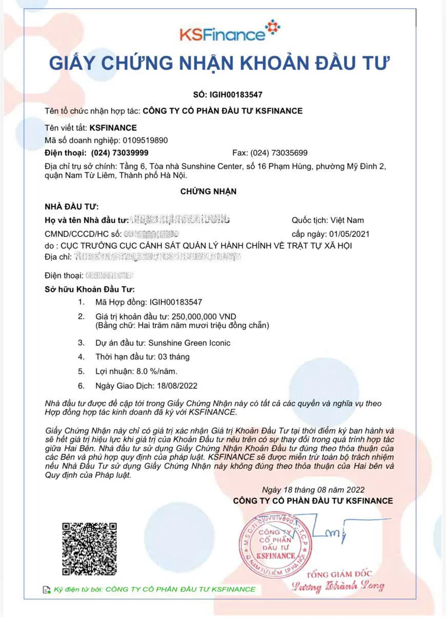 Giấy chứng nhận khoản đầu tư của KSFinance cung cấp cho nhà đầu tư.