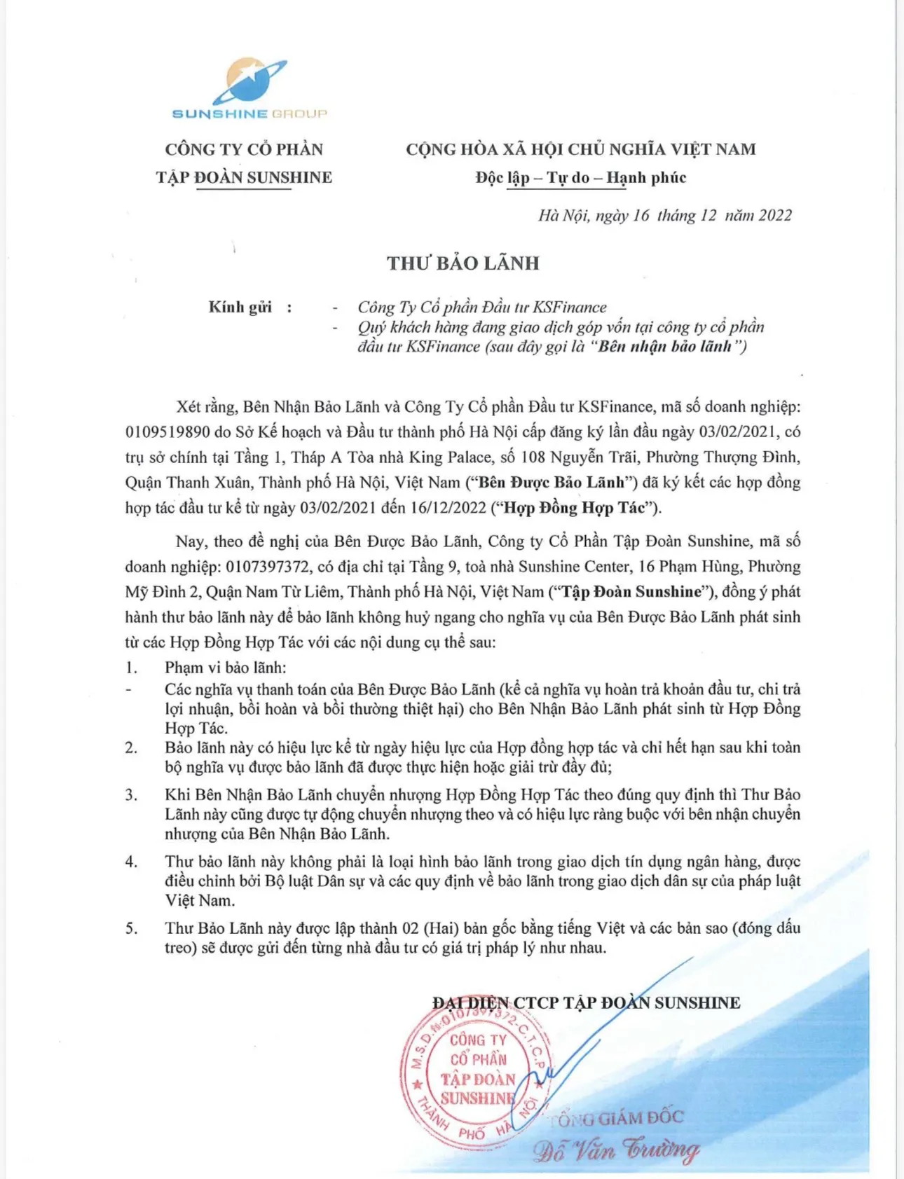 Điểm mấu chốt khiến nhà đầu tư tin tưởng xuống tiền là cam kết bảo lãnh từ Tập đoàn Sunshine. Bởi, hồ sơ nhà đầu tư cung cấp có văn bản "Thư Bảo lãnh" do Công ty CP Tập đoàn Sunshine phát hành ngày 16/12/2022. Trong thư, Tập đoàn Sunshine khẳng định sẽ "bảo lãnh không huỷ ngang" cho nghĩa vụ của KSF phát sinh từ các hợp đồng hợp tác đầu tư. Phạm vi bảo lãnh bao gồm các nghĩa vụ thanh toán của KSF (kể cả hoàn trả khoản đầu tư, chi trả lợi nhuận, bồi hoàn và bồi thường thiệt hại) cho Nhà đầu tư. Thư bảo lãnh này chỉ hết hạn sau khi toàn bộ nghĩa vụ được bảo lãnh đã được thực hiện hoặc giải trừ đầy đủ.