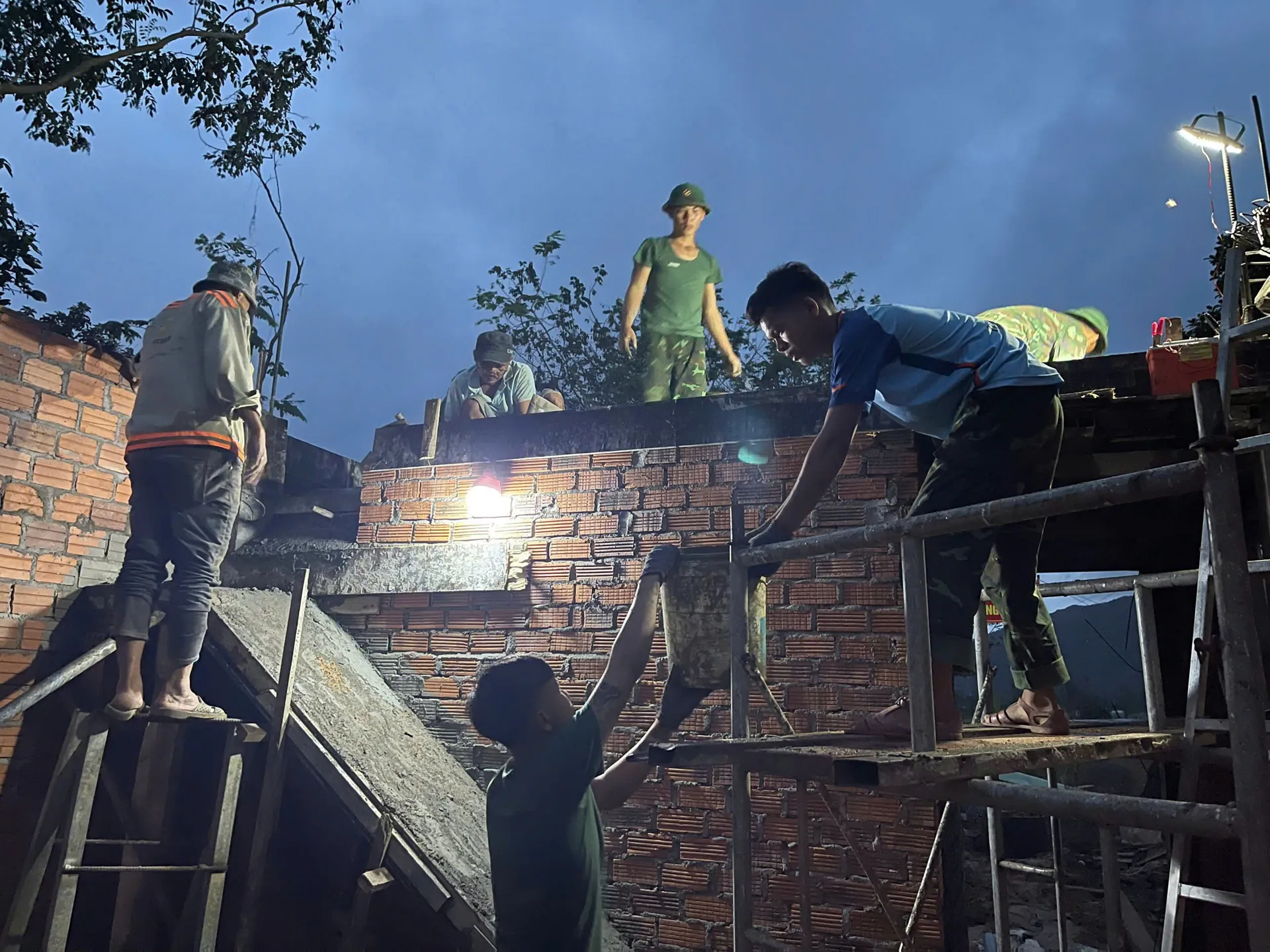 Giữa lúc ấy, bộ đội Trung đoàn 887, Bộ Chỉ huy Quân sự (CHQS) tỉnh Quảng Ngãi xuất hiện. Con đường vào nhà hẹp, xe chở vật liệu không thể tiếp cận, cán bộ, chiến sĩ phải dùng sức người chuyển từng bao xi măng, từng viên gạch. Từ sáng sớm, tiếng búa, tiếng xẻng vang lên đều đặn, báo hiệu một mái ấm mới đang được dựng lại.