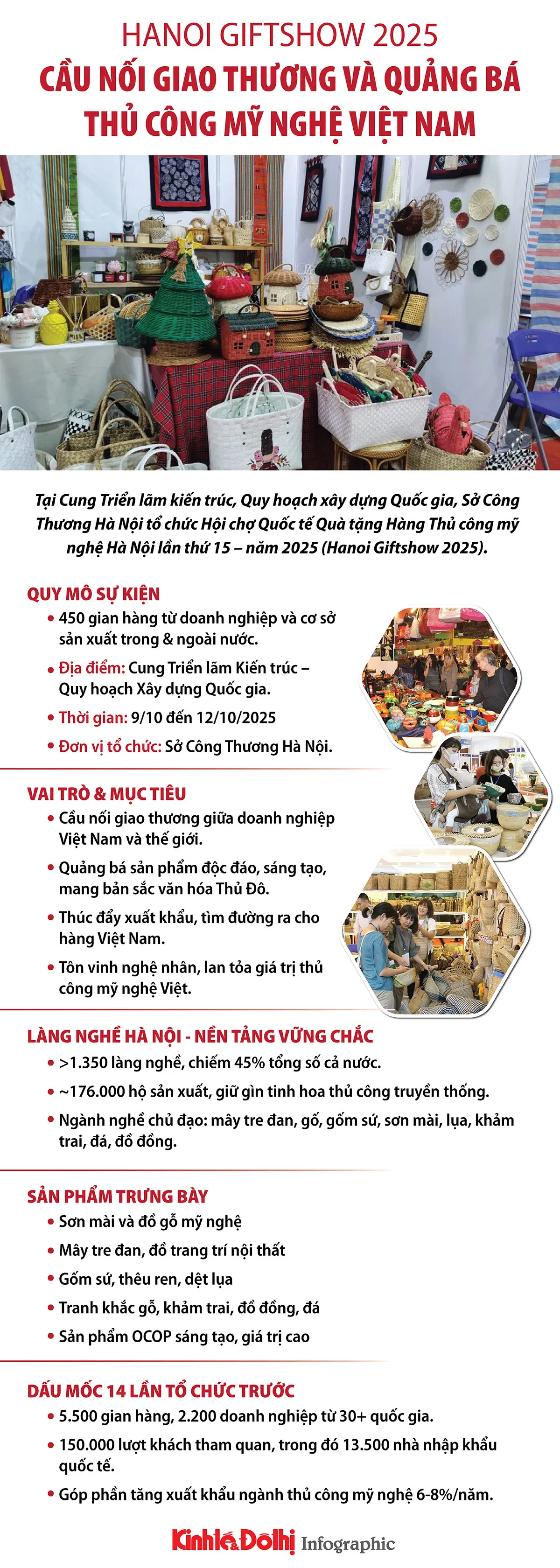 Kinhtedothi - Tại Cung Triển lãm kiến trúc, Quy hoạch xây dựng Quốc gia, Sở Công Thương Hà Nội đang tổ chức Hội chợ quốc tế quà tặng hàng thủ công mỹ nghệ Hà Nội lần thứ 15 - năm 2025 (Hanoi Giftshow 2025).