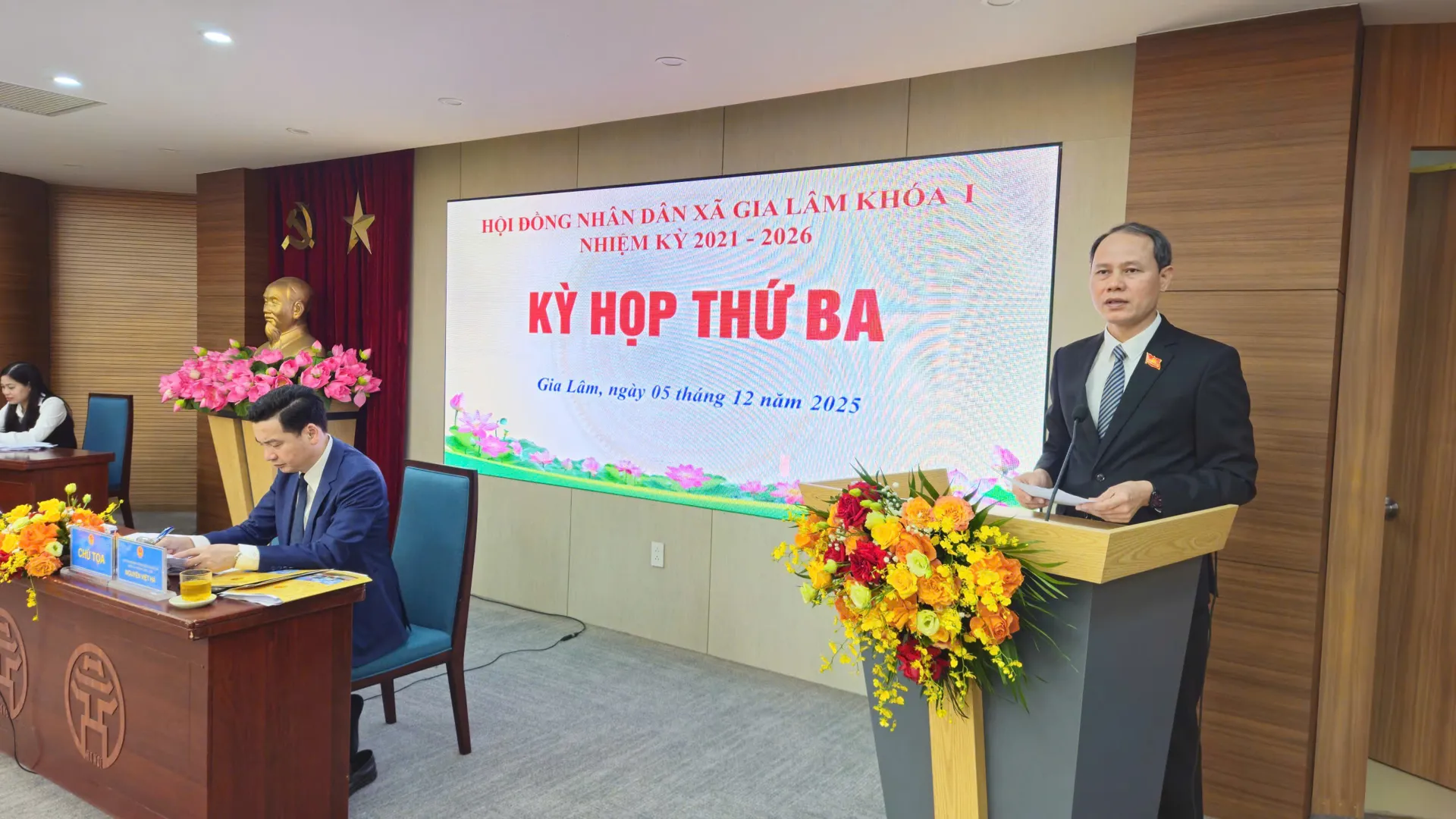 Sau một ngày làm việc nghiêm túc, dân chủ và trách nhiệm, Kỳ họp thứ ba HĐND xã Gia Lâm khóa I đã hoàn thành toàn bộ chương trình, thống nhất thông qua 12 báo cáo và 10 nghị quyết quan trọng, gồm: Kế hoạch phát triển kinh tế - xã hội năm 2026; phân bổ ngân sách; kế hoạch đầu tư công; kế hoạch sử dụng đất; nghị quyết về giải quyết kiến nghị cử tri và chất vấn; nghị quyết về việc ghép khu vực dân cư phường Thạch Bàn (quận Long Biên cũ) vào tổ dân phố Cơ Khí; nghị quyết về phân bổ biên chế, số lượng cán bộ, công chức, người hoạt động không chuyên trách; Chương trình giám sát năm 2026; Quy chế làm việc của HĐND xã khóa I…