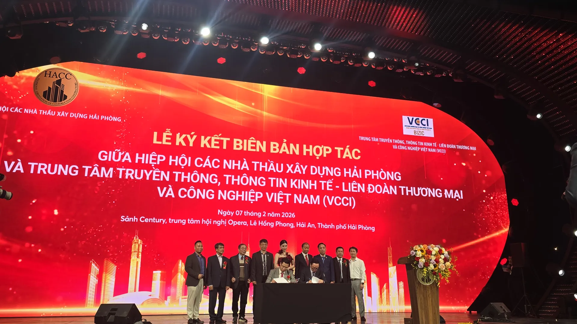 Lễ kí kết biên bản hợp tác giữa Hiệu hội các Nhà thầu xây dựng Hải Phòng với Trung tâm truyền thông, thông tin kinh tế - Liên đoàn thương mại và công nghiệp Việt Nam (VCCI). Ảnh: Vĩnh Quân