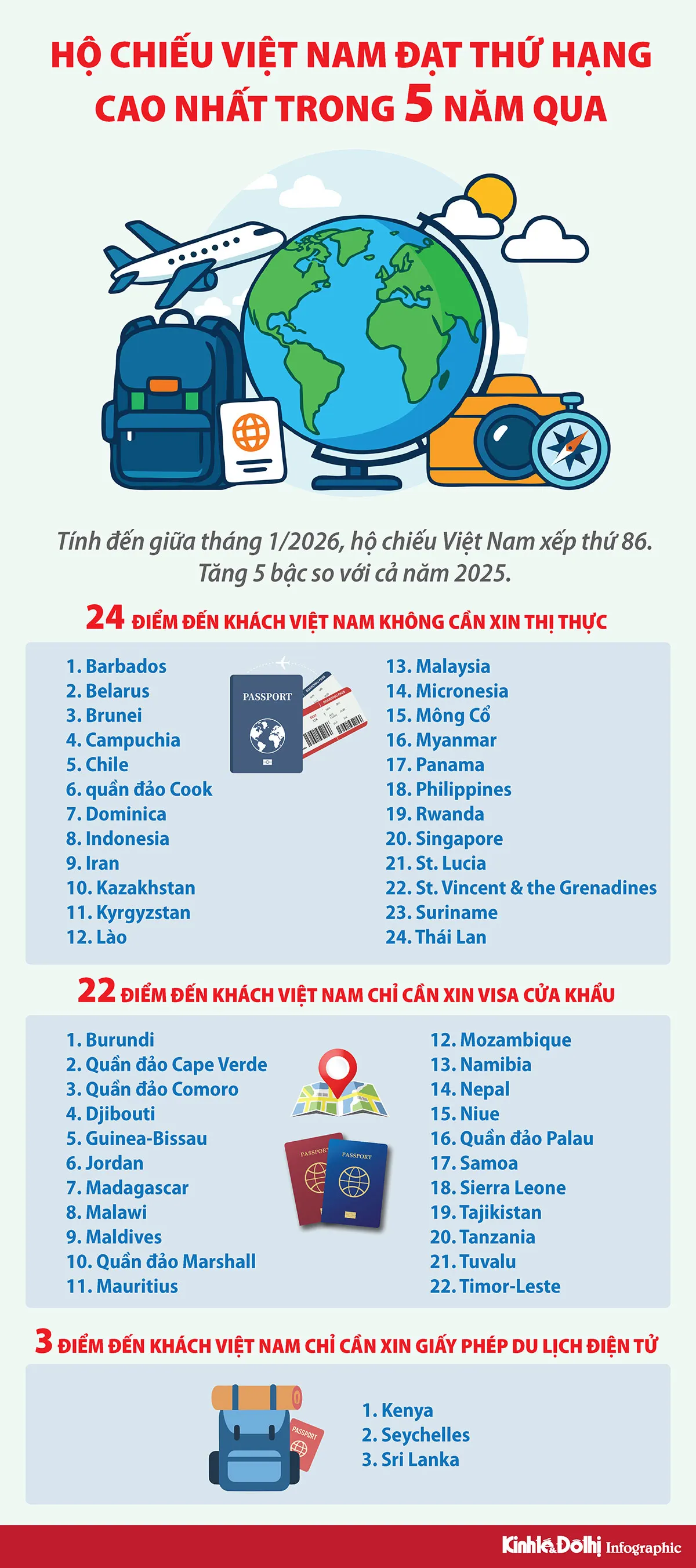 Kinhtedothi - Trong bảng xếp hạng hộ chiếu thế giới 2026 của Henley Passport Index, hộ chiếu Việt Nam xếp thứ 86, tăng 5 bậc so với năm 2025, cao nhất kế từ năm 2021.