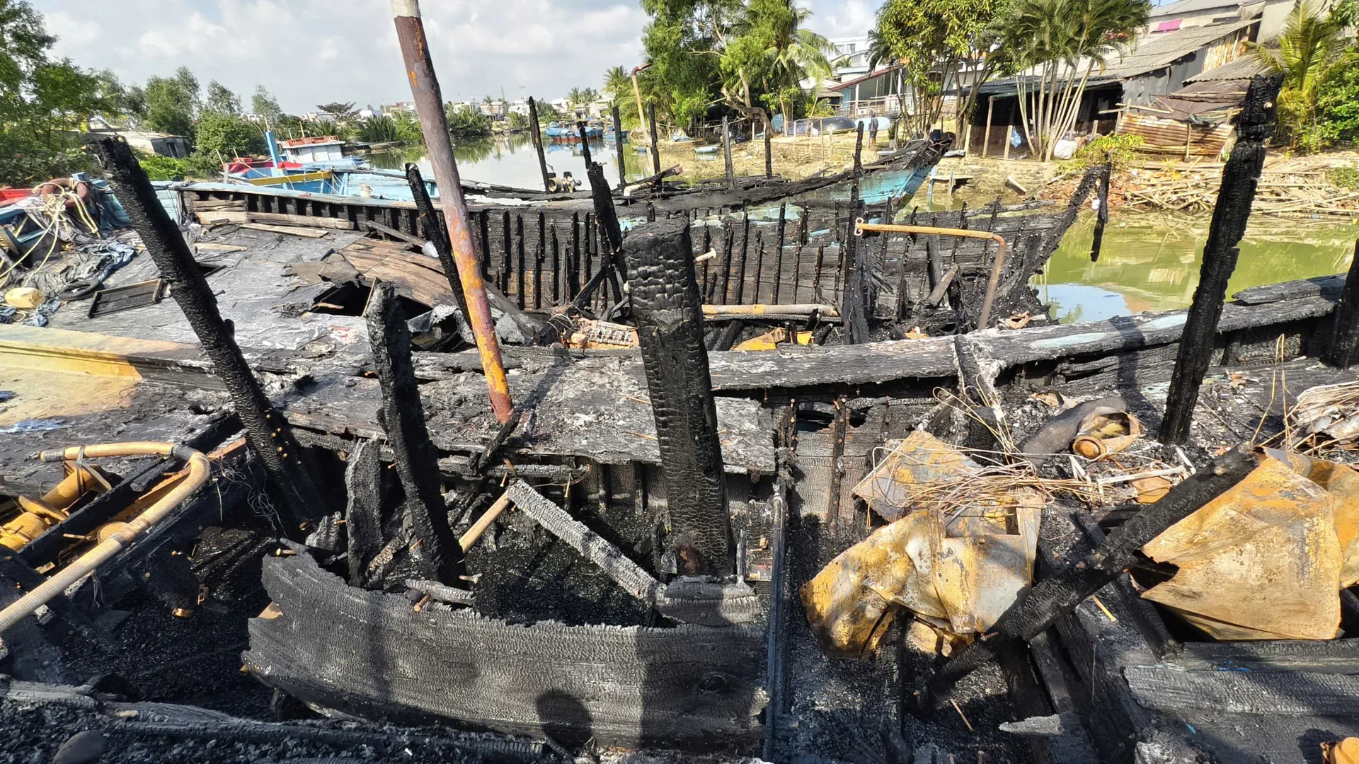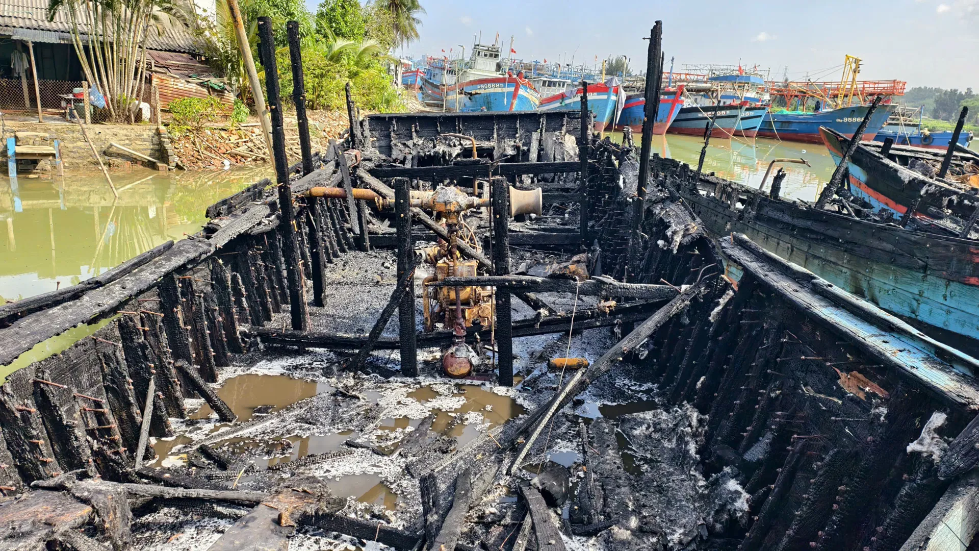 Sáng 15/1, khi khói lửa đã tắt hẳn ở bến neo đậu tàu cá trên sông Trà Bồng (đoạn qua thôn Mỹ Tân, xã Bình Sơn, tỉnh Quảng Ngãi), ông Nguyễn Khắc Vĩ lặng lẽ đứng nhìn con tàu của mình nằm bất động bên bờ. Con tàu dài hơn 20m, công suất 770CV từng theo ông ra khơi suốt nhiều năm, giờ chỉ còn trơ lại bộ khung cong vênh, ám đen vì lửa.