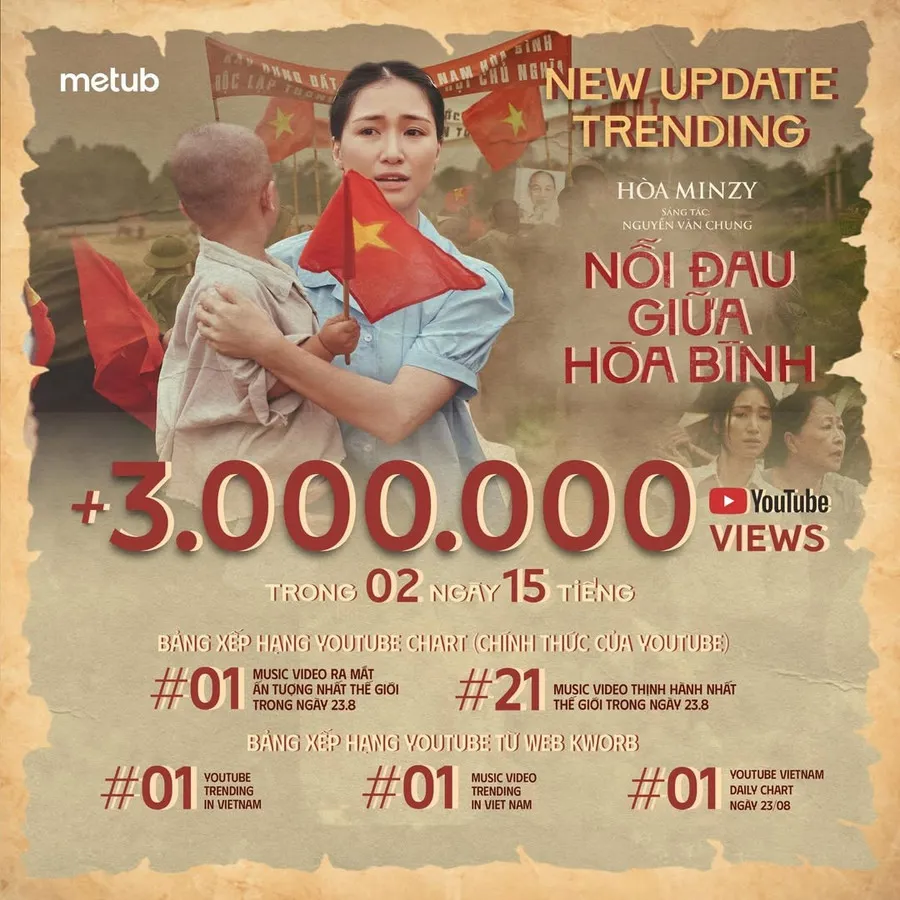 Trên facebook cá nhân, Hòa Minzy xúc động lan tỏa sự vui mừng khi thông báo MV “Nỗi đau giữa hòa bình” chính thức đạt Top 1 Music Video ra mắt ấn tượng nhất thế giới. Sản phẩm còn xuất sắc góp mặt ở Top 21 Music Video thịnh hành nhất thế giới cùng ngày.