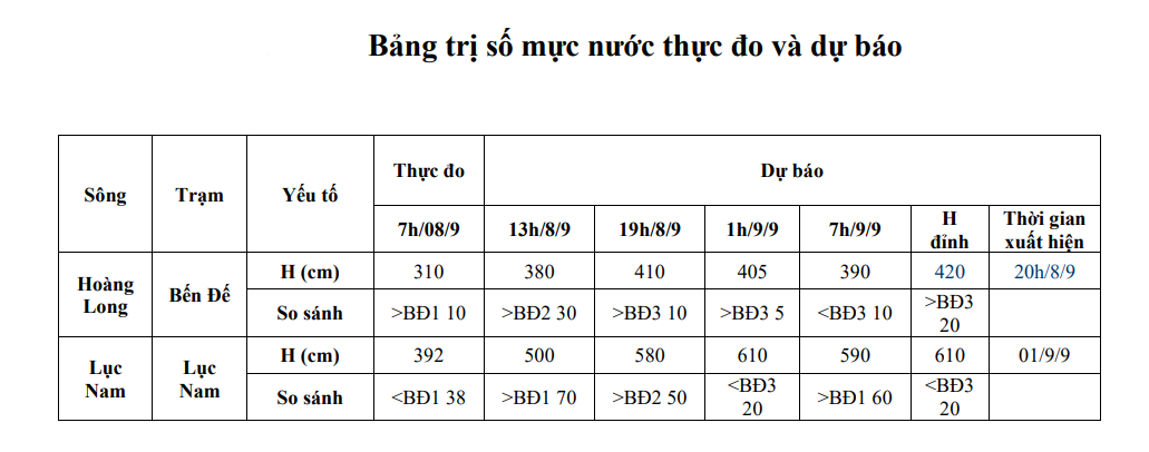 Dự báo, trong 12-24 giờ tới, mực nước trên sông Thao, sông Lục Nam và sông Hoàng Long, sông Bưởi, sông Mã tiếp tục lên. Đỉnh lũ trên sông Thao tại Yên Bái có khả năng đạt trên mức BĐ1, trên sông Hoàng Long tại Bến Đế trên BĐ3, trên sông Lục Nam tại Lục Nam xấp xỉ BĐ3.