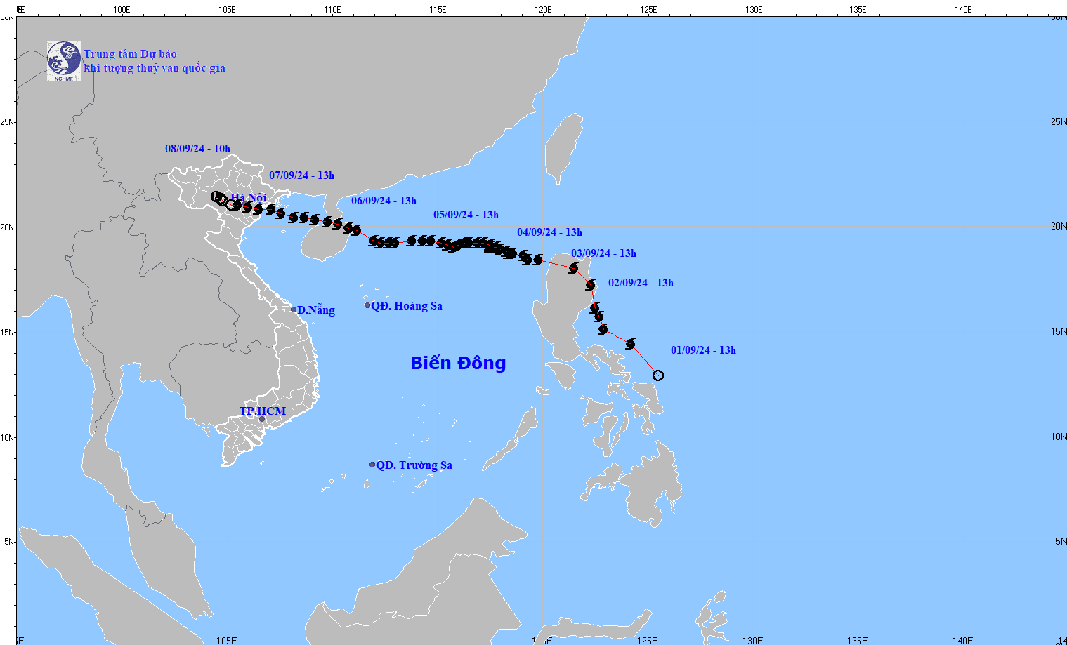 - Phía Tây Bắc Bộ: từ sáng ngày 08/9 đến sáng ngày 09/9, có mưa to đến rất to với lượng mưa phổ biến 100-200mm, cục bộ có nơi trên 400mm. Từ sáng ngày 09/9 đến sáng ngày 10/9 có mưa to đến rất to với lượng mưa phổ biến 50-120mm, có nơi trên 200mm.