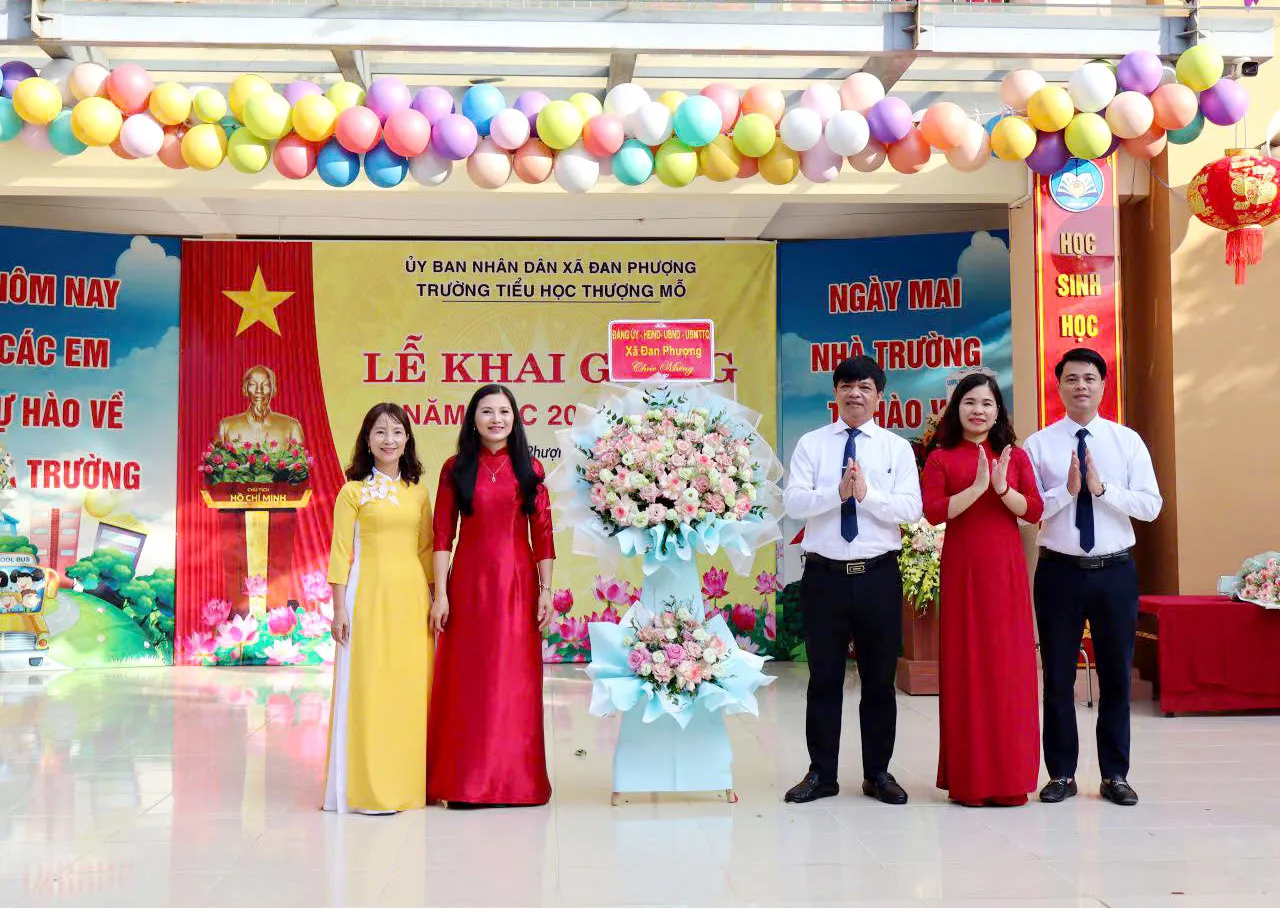 Chủ tịch UBND xã Đan Phượng Nguyễn Viết Đạt tặng hoa chúc mừng Trường Tiểu học Thượng Mỗ.