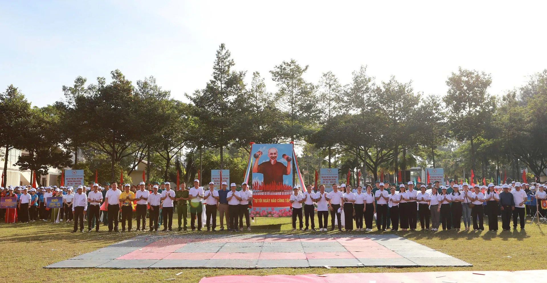 Cán bộ, người dân phường Bình Dương rèn luyện thân thể theo gương Chủ tịch Hồ Chí Minh vĩ đại. Ảnh: Nguyễn Linh