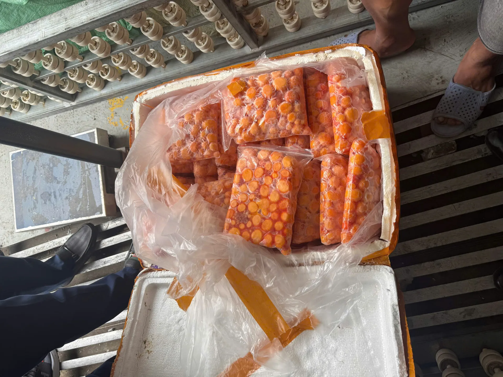 Qua kiểm tra, lực lượng chức năng phát hiện 12,3 tấn thực phẩm không bảo đảm an toàn, gồm: 8,3 tấn sụn gà có chữ nước ngoài; 3,6 tấn trứng non và 0,48 tấn mỡ động vật. Tổng giá trị lô hàng ước tính hơn 1 tỷ đồng.
