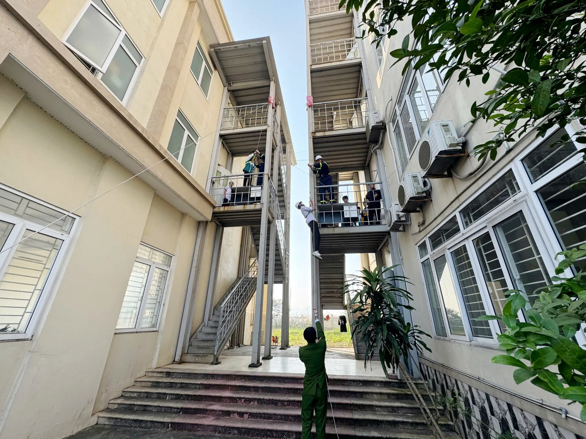 Học sinh thực hành trải nghiệm đu dây thoát nạn từ trên cao khi có đám cháy xảy ra.