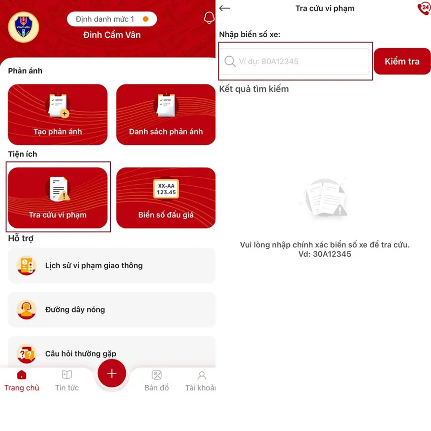 Bước 3: Sau khi hoàn tất đăng kí, người dùng có thể sử dụng các tính năng có trong ứng dụng. Để kiểm tra phạt nguội người dùng chọn mục "Tra cứu vi phạm" và nhập biển số xe để kiểm tra.