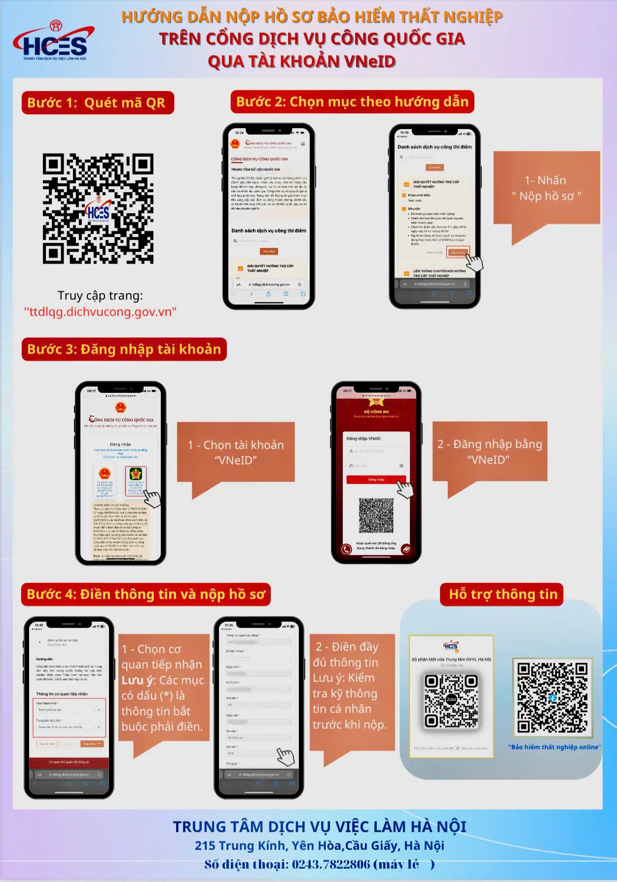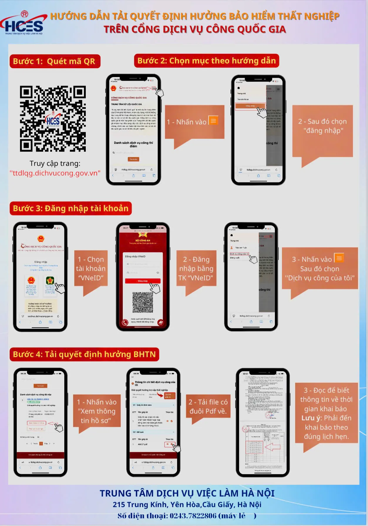 Trung tâm Dịch vụ việc làm Hà Nội hướng dẫn tải quyết định hưởng bảo hiểm thất nghiệp và nộp hồ sơ bảo hiểm thất nghiệp trực tuyến trên Cổng dịch vụ công quốc gia qua tài khoản VNeID.