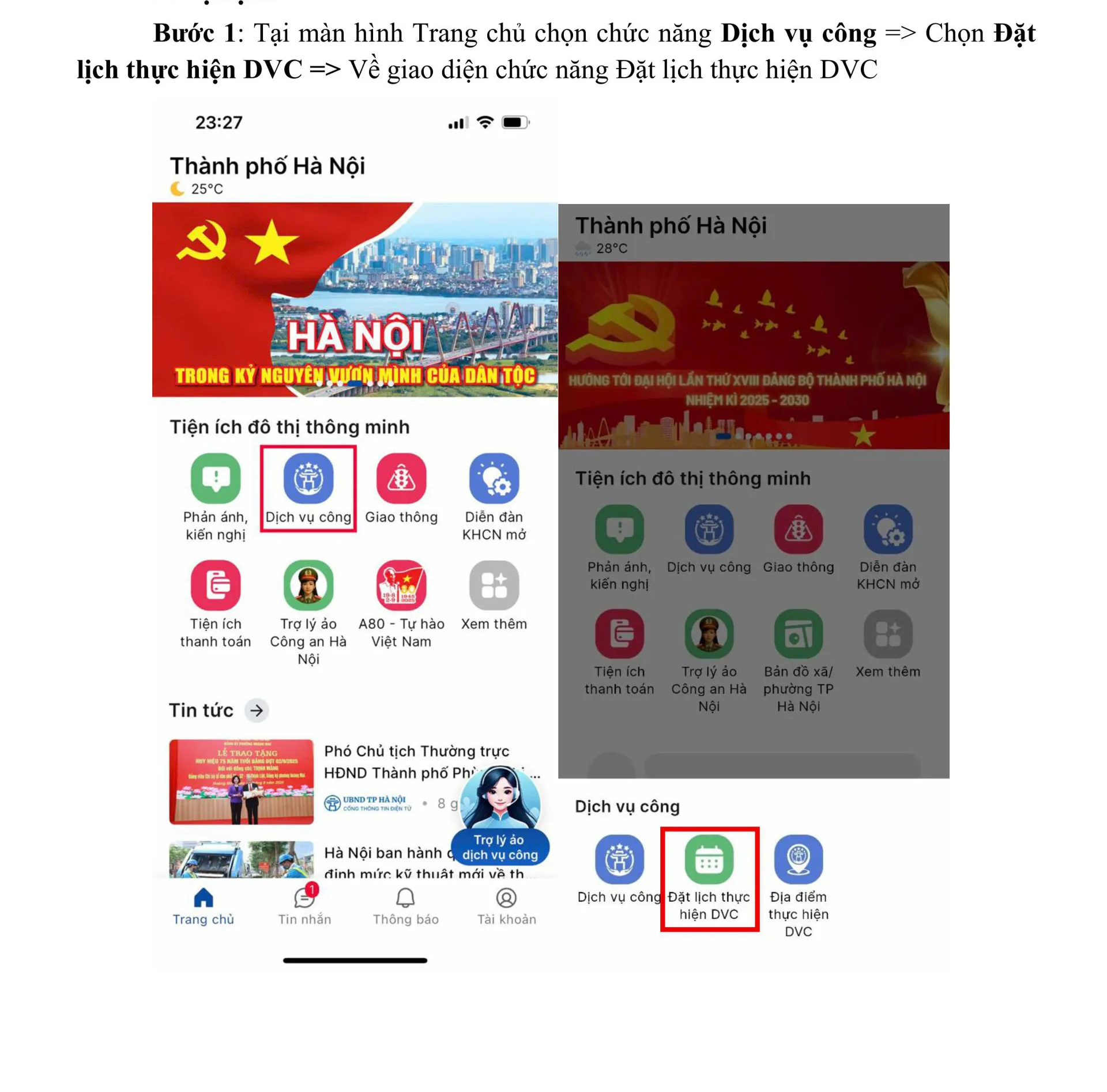 Bước 1: Tại màn hình Trang chủ của ứng dụng iHanoi, chọn mục Dịch vụ công → Đặt lịch thực hiện DVC.