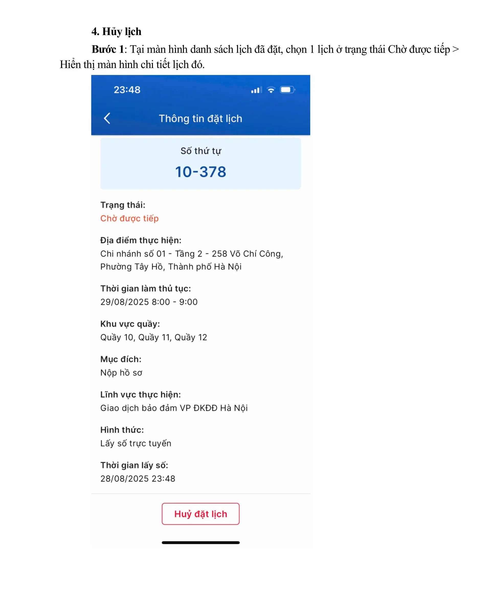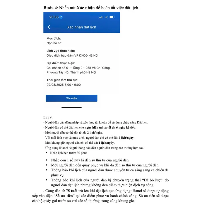 Theo đó, tính năng đặt lịch dịch vụ công (DVC) trực tuyến trên ứng dụng iHanoi áp dụng đồng bộ tại tất cả Chi nhánh Trung tâm PVHCC. Người dân, doanh nghiệp có thể đăng ký lấy số thứ tự trực tuyến ngay tại nhà, trên ứng dụng iHanoi, cho ngày hiện tại hoặc 06 ngày kế tiếp. Mỗi người dân có thể đặt tối đa 02 lượt hẹn/ngày, mỗi lượt theo từng lĩnh vực thủ tục hành chính.