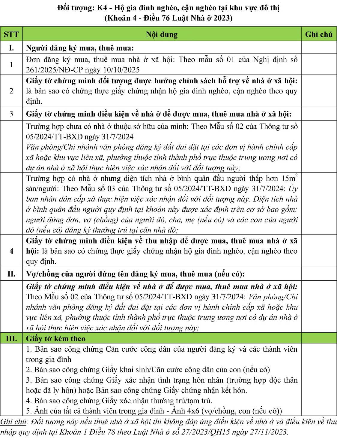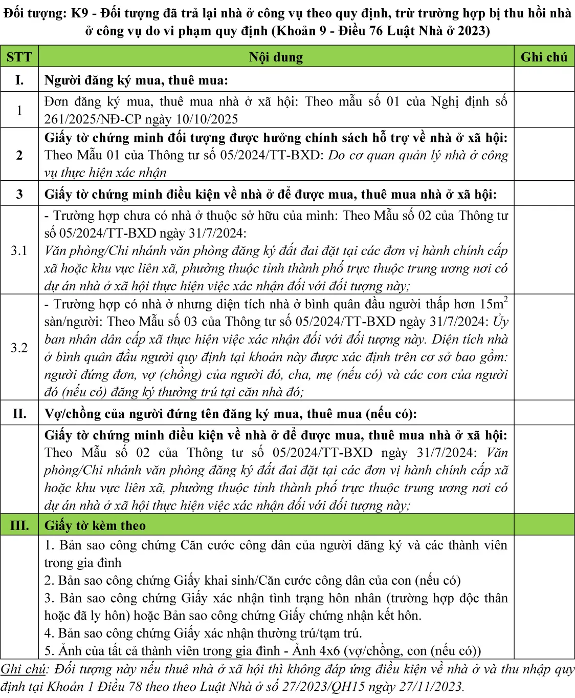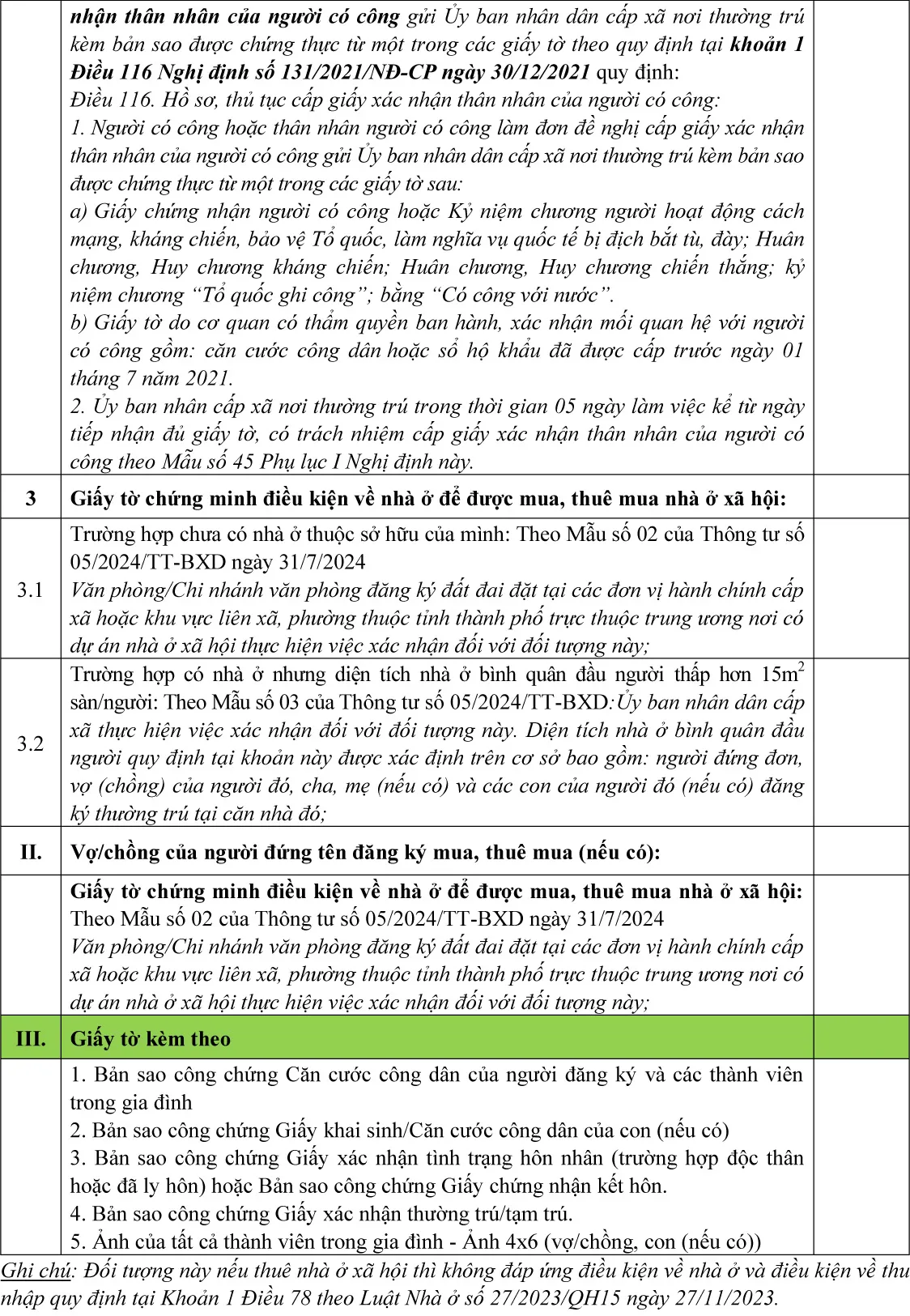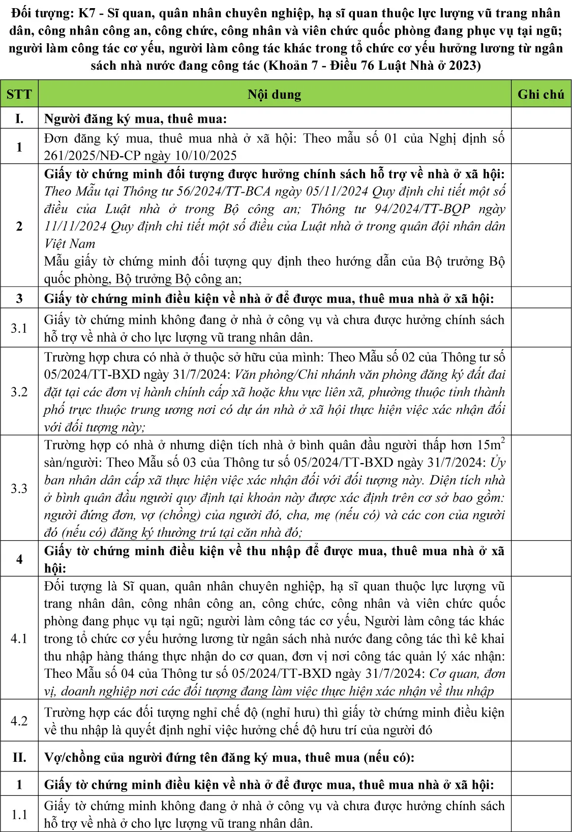 (Chi tiết khách hàng tham khảo thêm tại Luật nhà ở 2023; Nghị định số 100/2024/NĐ-CP ngày 26/7/2024 về phát triển và quản lý nhà ở xã hội; Nghị định số 261/2025/NĐ-CP ngày 10/10/2025; Thông tư số 05/2024/TT-BXD ngày 31/7/2024 về Quy định chi tiết một số điều của Luật Nhà ở; Thông tư 56/2024/TT-BCA ngày 05/11/2024 Quy định chi tiết một số điều của Luật nhà ở trong Bộ công an; Thông tư 94/2024/TT-BQP ngày 11/11/2024 Quy định chi tiết một số điều của Luật nhà ở trong quân đội nhân dân Việt Nam)