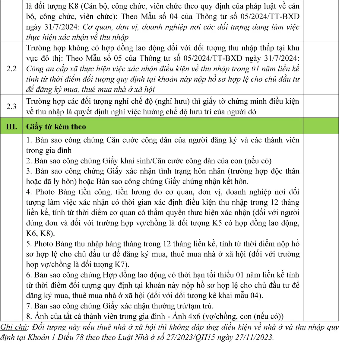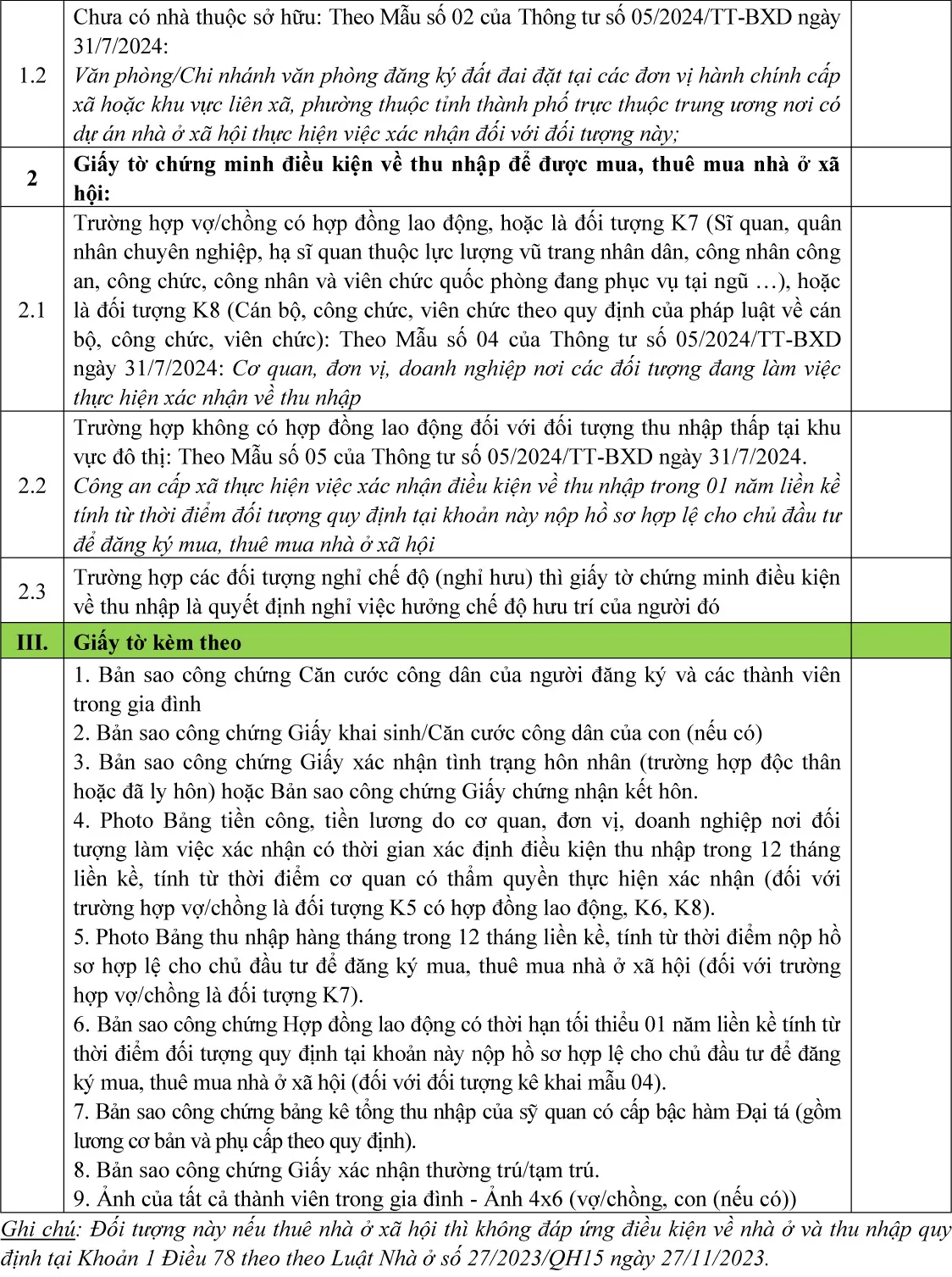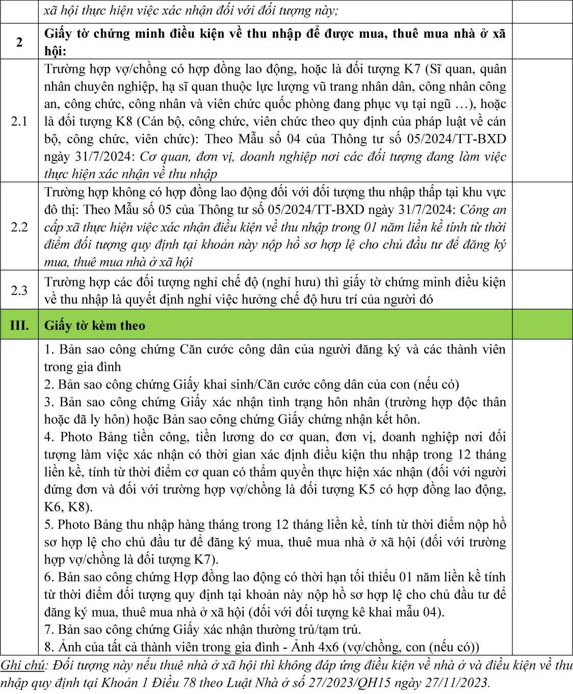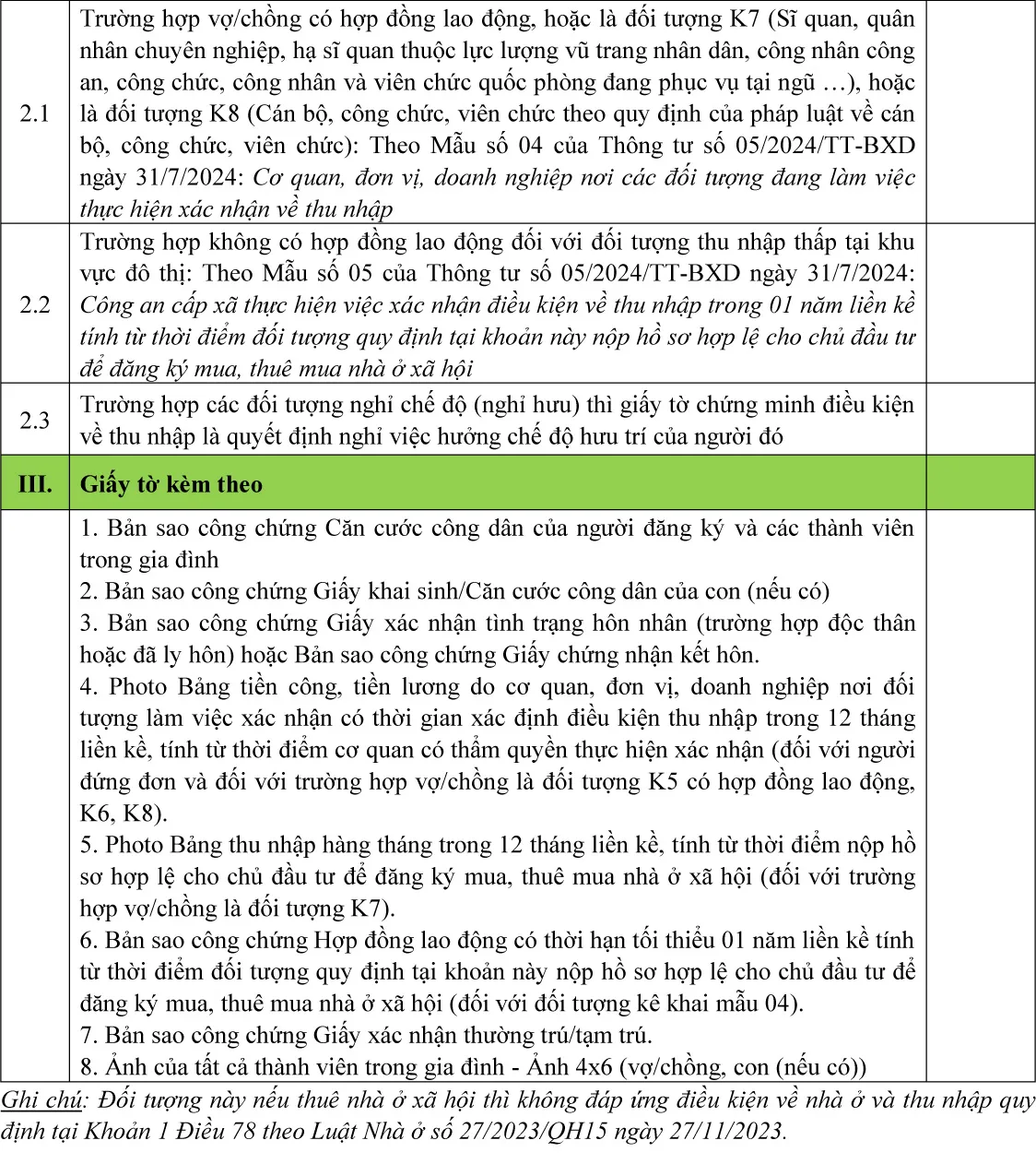 + Đối tượng K1, K4, K5, K6, K7, K8, K9, K10 nếu mua, thuê mua nhà ở xã hội thì phải đáp ứng điều kiện về nhà ở và thu nhập theo Điều II dưới đây (các đối tượng K1, K9, K10 nếu mua, thuê mua nhà ở xã hội thì không phải đáp ứng điều kiện về thu nhập);