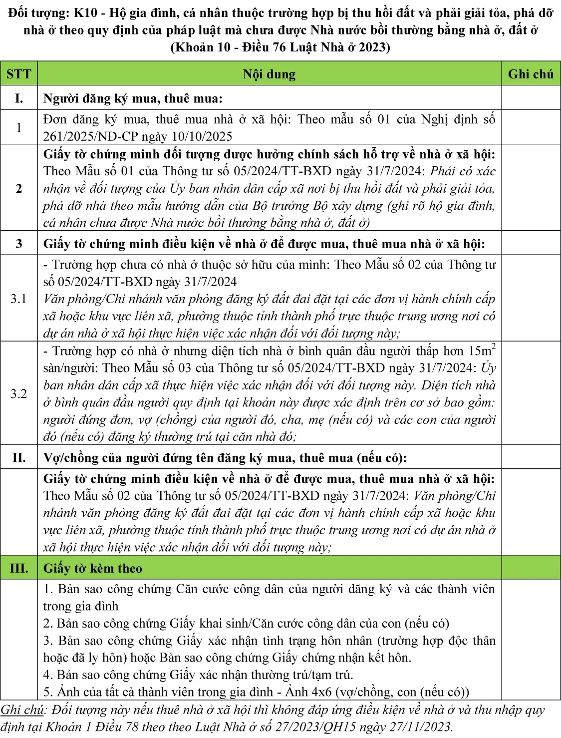 - K10: Hộ gia đình, cá nhân thuộc trường hợp bị thu hồi đất và phải giải tỏa, phá dỡ nhà ở theo quy định của pháp luật mà chưa được Nhà nước bồi thường bằng nhà ở, đất ở;