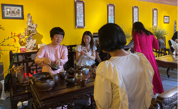 Du khách trải nghiệm về tại không gian trà Hà Nội. Ảnh: Mai Chi