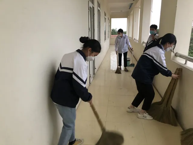 | Học sinh lớp 9 trường THCS Quất Động phấn khởi tham gia quét dọn trường lớp để chuẩn bị cho ngày đi học trở lại |