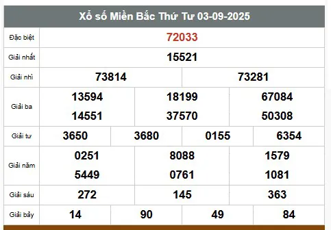 Kết quả xổ số miền Bắc - trực tiếp cập nhật xổ số miền Bắc hôm nay ngày 3/9/2025