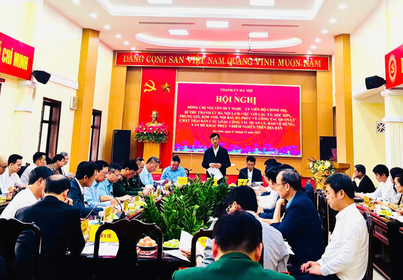 Kinhtedothi - Ngày 7/12, Ủy viên Bộ Chính trị, Bí thư Thành ủy Hà Nội Nguyễn Duy Ngọc đã chủ trì buổi làm việc với lãnh đạo 5 xã Sóc Sơn, Nội Bài, Trung Giã, Đa Phúc, Kim Anh về tình hình thực hiện nhiệm vụ chính trị, phát triển kinh tế - xã hội, chỉ đạo tháo gỡ khó khăn trong công tác quản lý chất thải rắn, quản lý, bảo vệ rừng, và sự tham gia của các xã cùng Thành phố giải quyết 5 điểm nghẽn (ngập úng, ùn tắc giao thông, vệ sinh môi trường, ô nhiễm không khí, an toàn thực phẩm và trật tự đô thị).