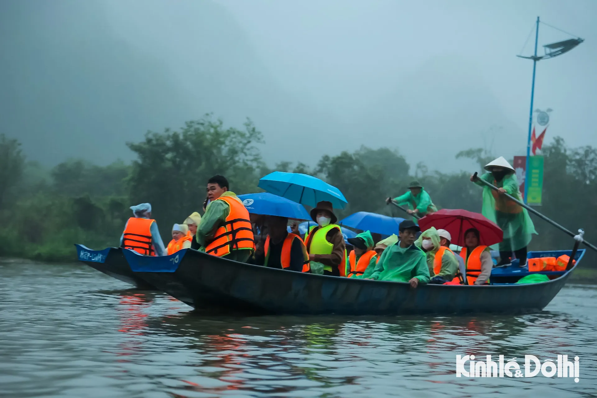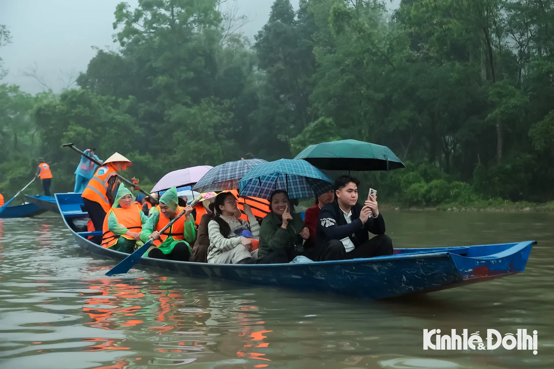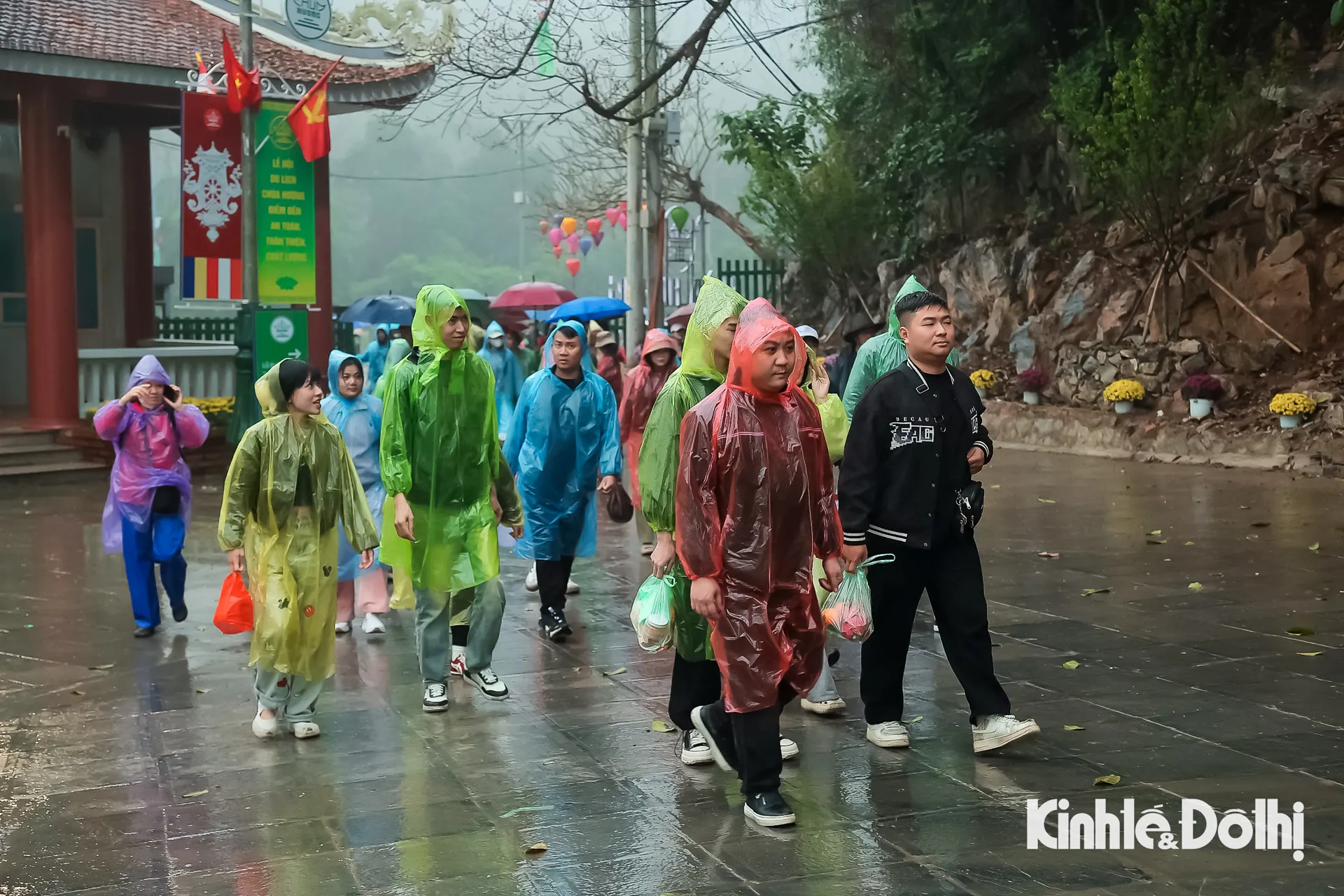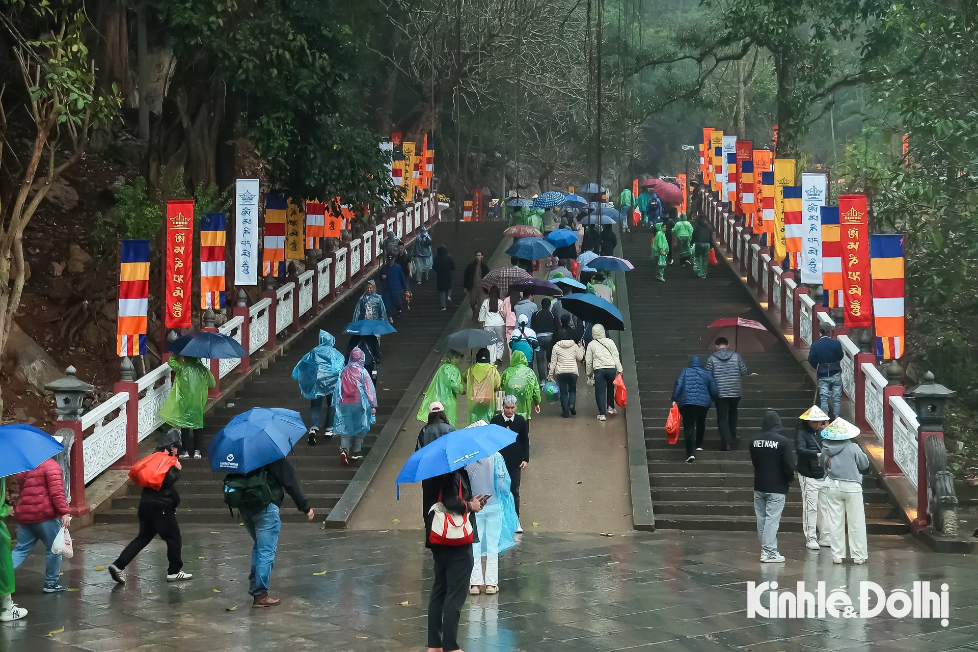 Mặc dù trong ngày khai hội, trời đổ mưa nhưng lượng người đến chùa Hương rất đông.