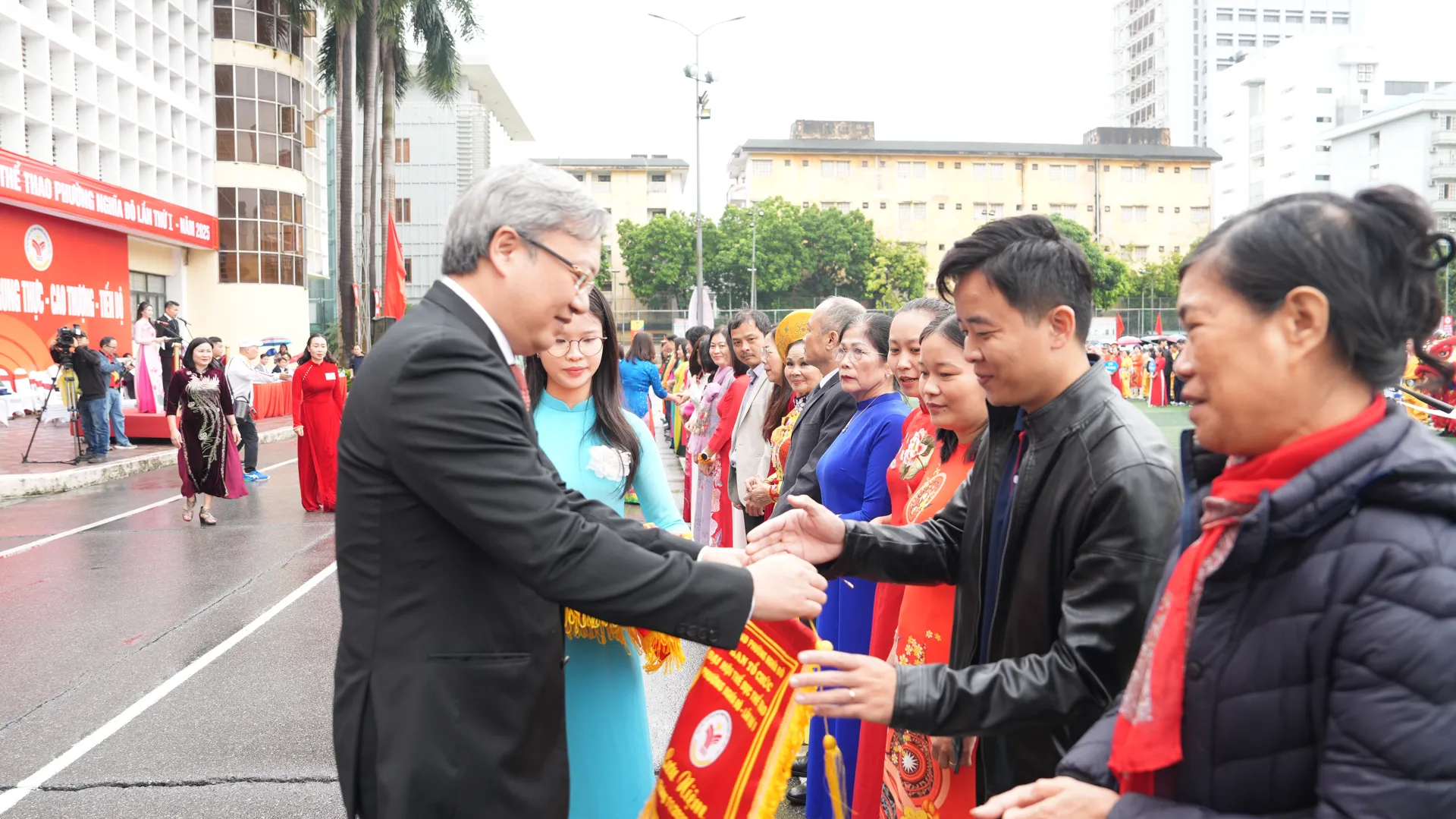 Lãnh đạo phường Nghĩa Đô tặng cờ chúc mừng các đội tham gia Đại hội.