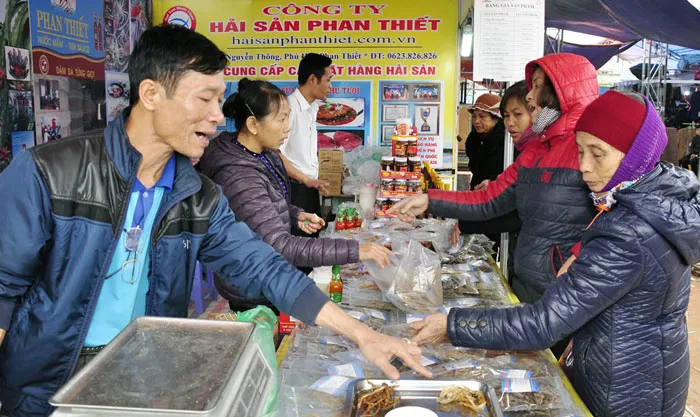 | Người dân lựa chọn các sản phẩm đặc sản tại hội chợ. |