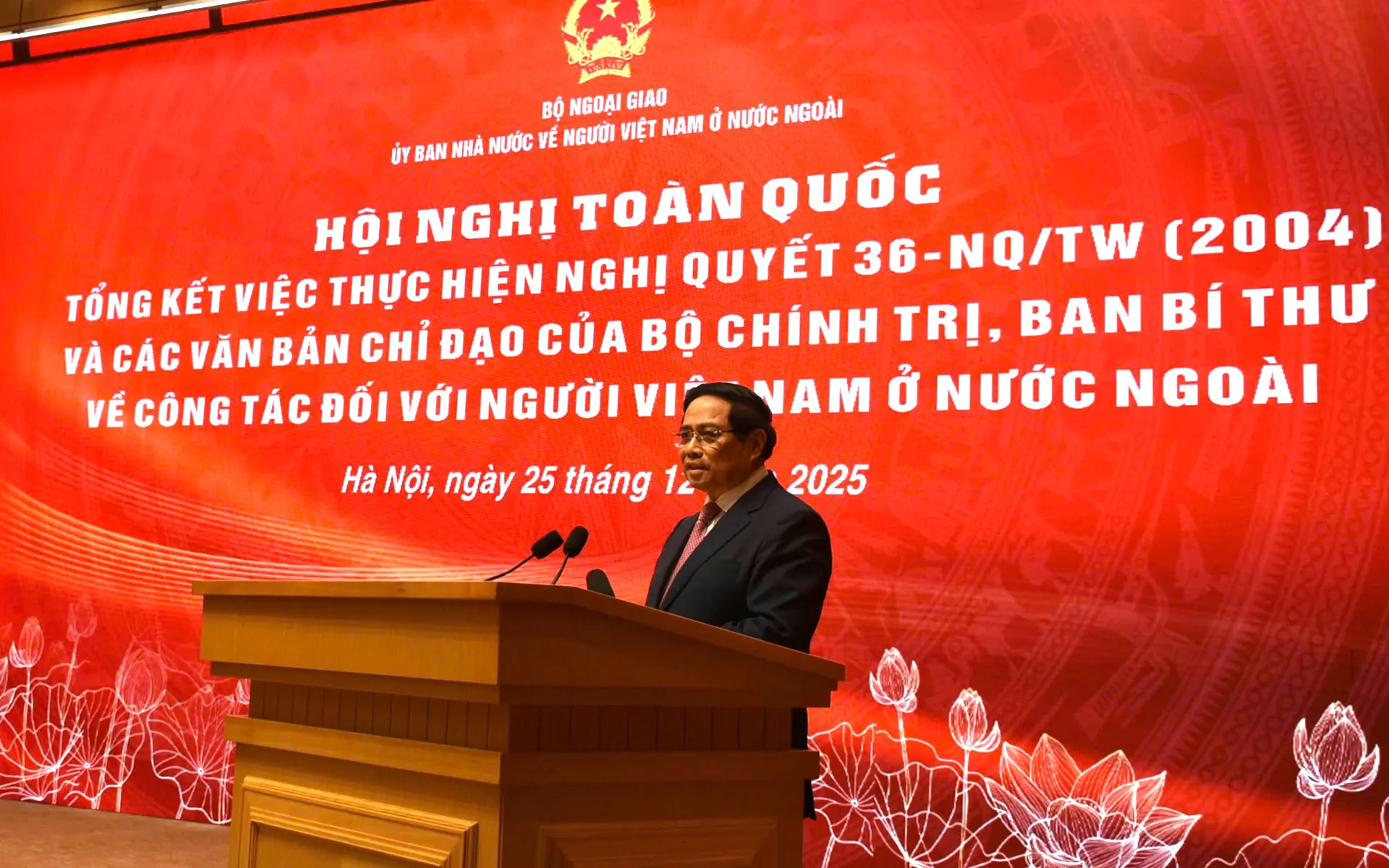 Phát biểu tại Hội nghị, Thủ tướng Chính phủ Phạm Minh Chính khẳng định việc tổng kết 20 năm thực hiện Nghị quyết 36-NQ/TW là rất đúng lúc, rất cần thiết và có ý nghĩa đặc biệt quan trọng trong bối cảnh đất nước bước vào giai đoạn phát triển mới; quá trình thực hiện tổng kết được Bộ Ngoại giao triển khai nghiêm túc theo ý kiến chỉ đạo của Ban Bí thư, Đảng ủy Chính phủ, với sự phối hợp chặt chẽ của các đảng ủy, ban, bộ, ngành, trung ương và các địa phương, sự hưởng ứng tích cực của cộng đồng người Việt Nam ở nước ngoài.