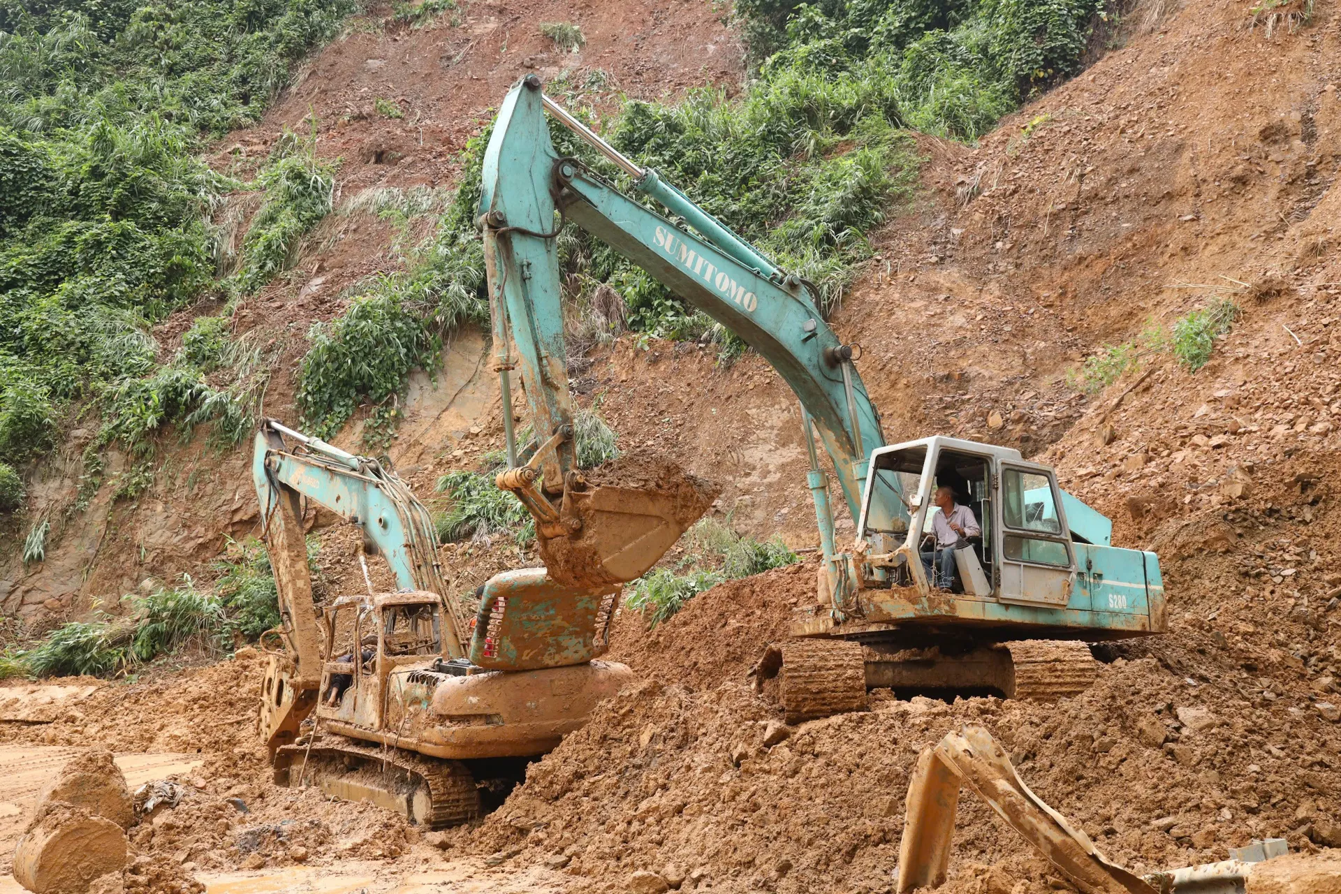 Công nhân và máy móc khẩn trương khắc phục sạt lở đèo Khánh Lê.