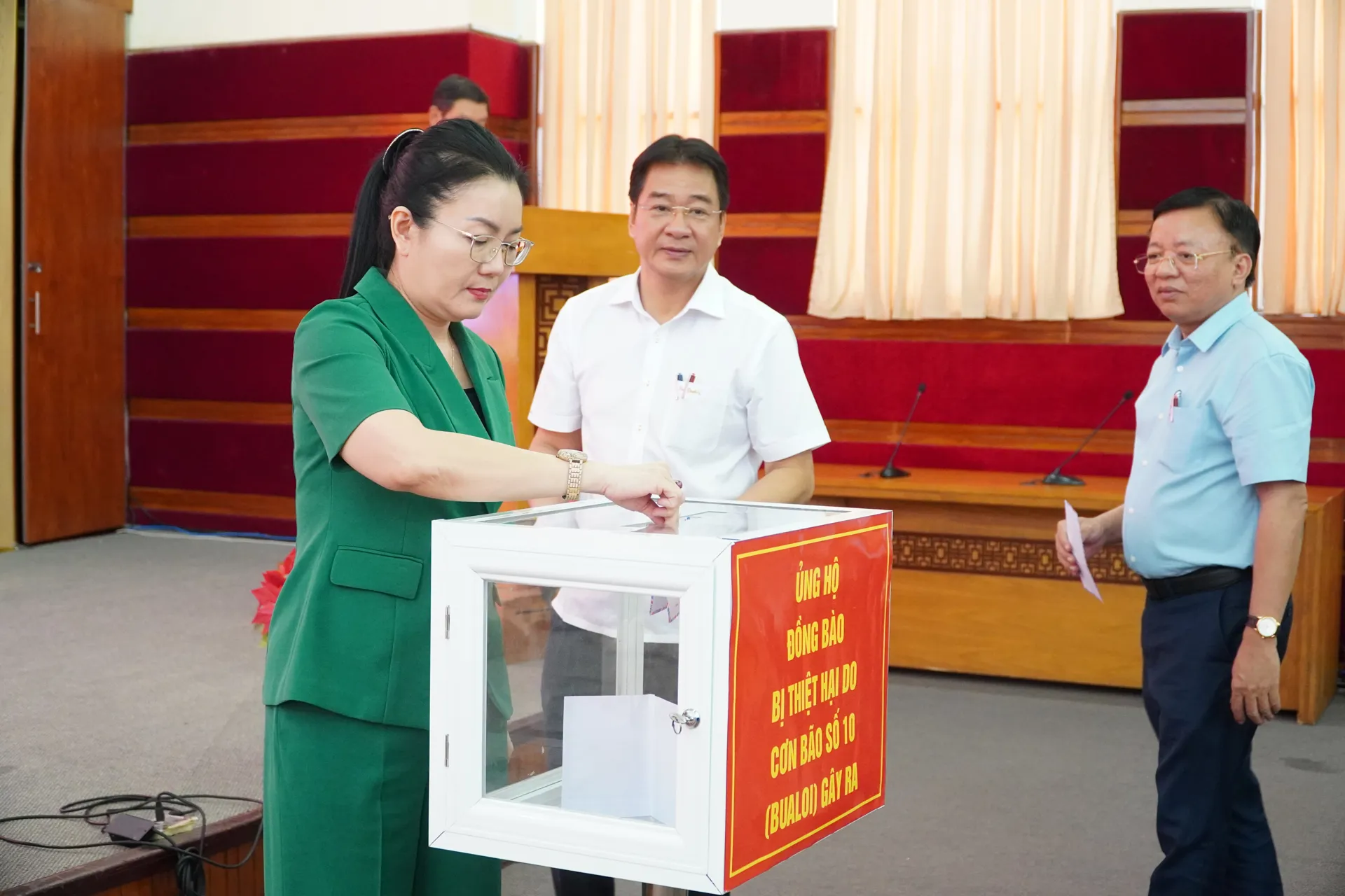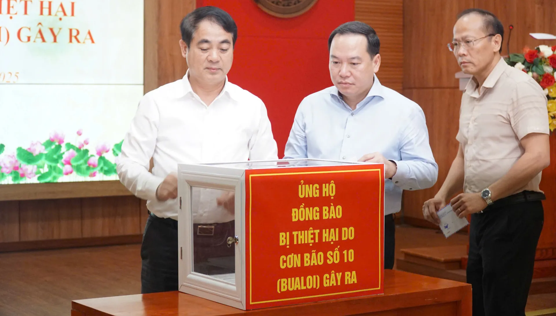 Bí thư Tỉnh ủy Nghiêm Xuân Thành; Phó Bí thư Thường trực Hồ Xuân Trường; Phó Bí thư Tỉnh ủy, Chủ tịch Ủy ban MTTQ Việt Nam tỉnh Nguyễn Khắc Hà quyên góp hỗ trợ đồng bào thiệt hại do bão số 10.