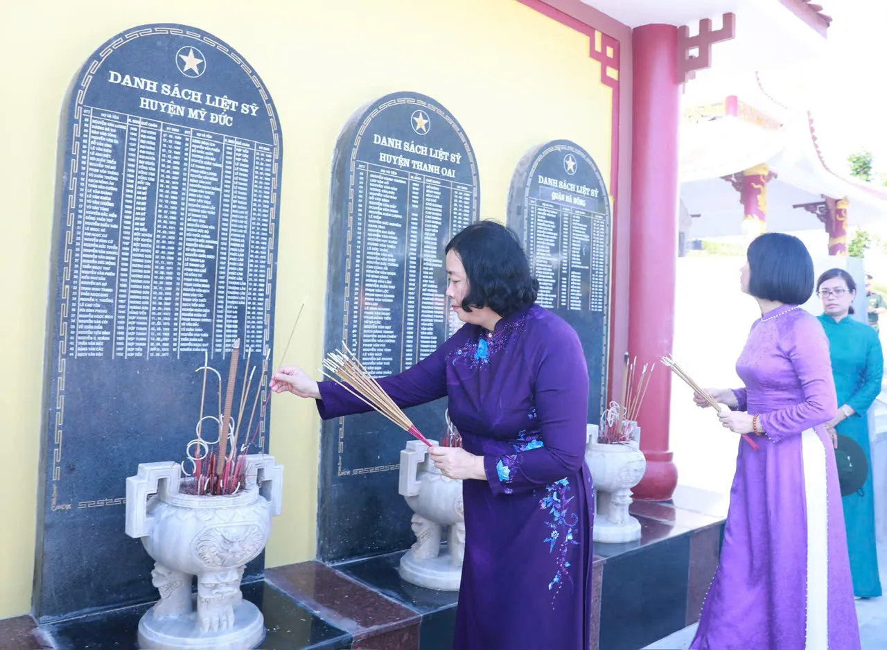 Bí thư Thành ủy Hà Nội Bùi Thị Minh Hoài cùng các đồng chí lãnh đạo của TP Hà Nội và tỉnh Quảng Trị dâng hương, dâng hoa, tưởng niệm các anh hùng liệt sĩ tại Đền tưởng niệm liệt sĩ Trường Sơn tại Bến phà Long Đại.