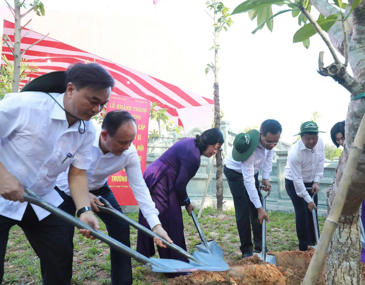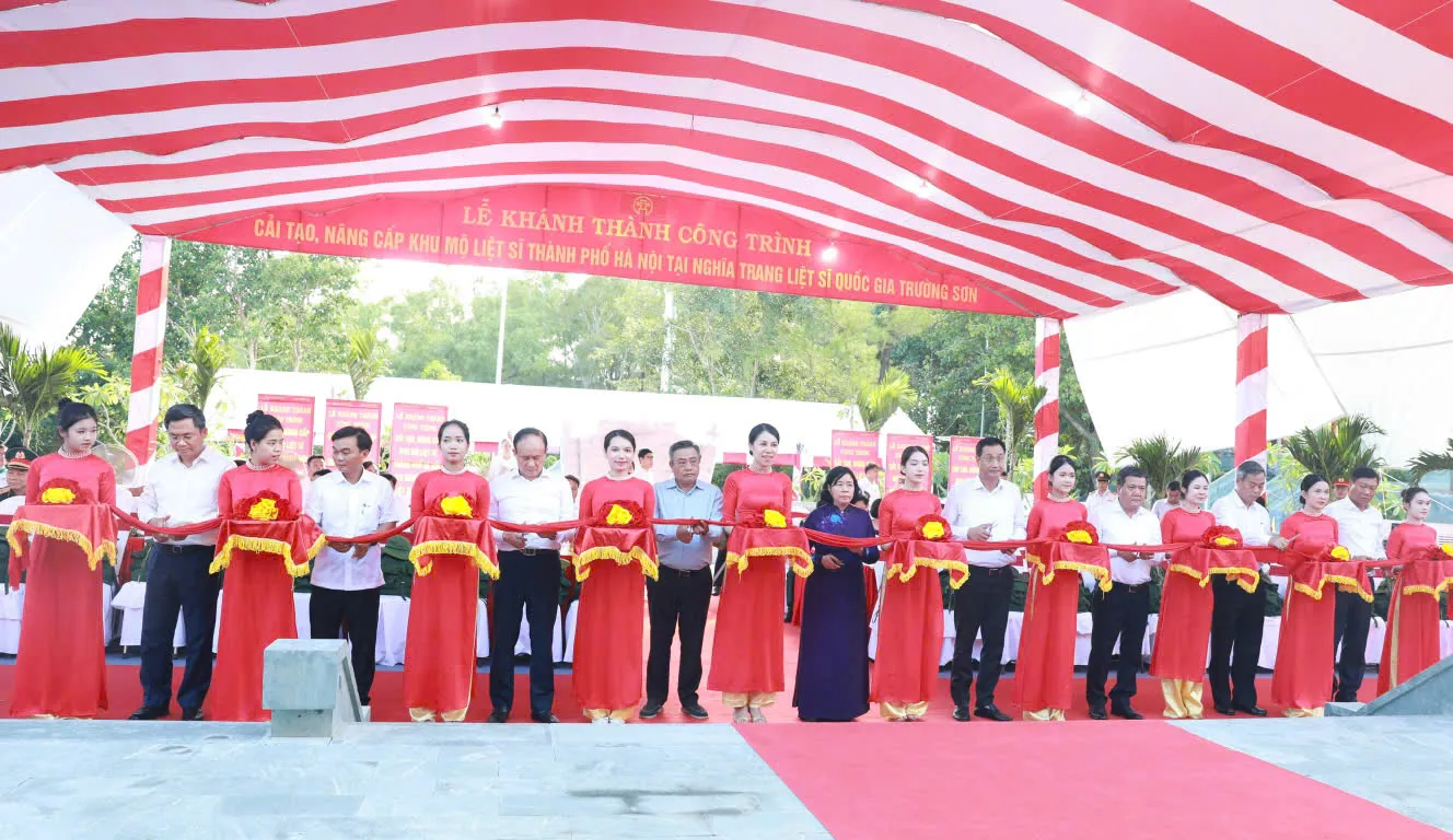 Tại Lễ khánh thành, Bí thư Thành ủy Hà Nội Bùi Thị Minh Hoài cùng các đồng chí lãnh đạo của TP Hà Nội và tỉnh Quảng Trị thực hiện nghi thức cắt băng khánh thành công trình cải tạo, nâng cấp khu mộ liệt sĩ TP Hà Nội tại Nghĩa trang liệt sĩ Quốc gia Trường Sơn.