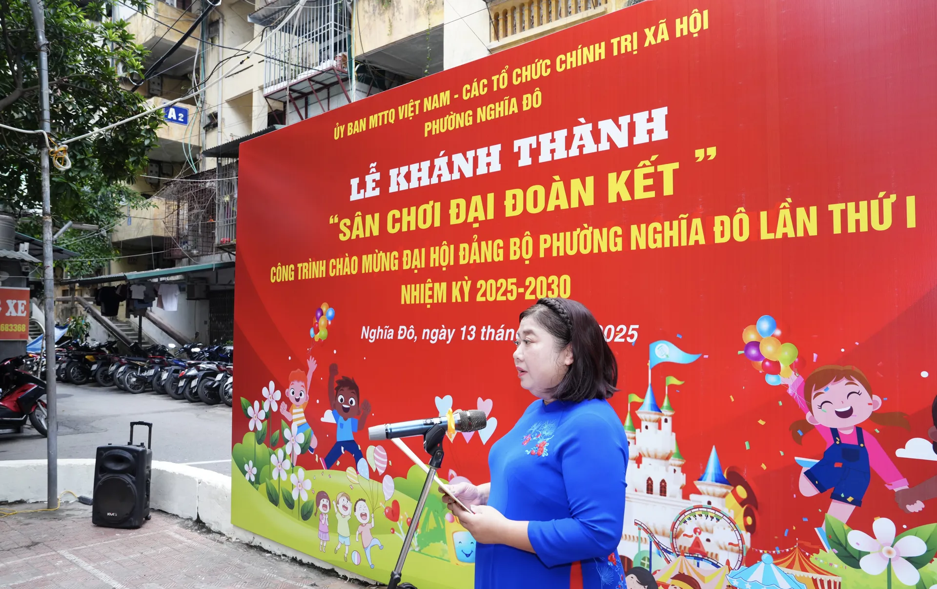 Chủ tịch Uỷ ban MTTQ Việt Nam phường Nghĩa Đô Nguyễn Kim Lê cho biết, nhằm thiết thực chào mừng Đại hội đại biểu Đảng bộ phường Nghĩa Đô lần thứ I, nhiệm kỳ 2025 - 2030. Ủy ban MTTQ phường cùng với các tổ chức chính trị - xã hội đã chủ động, thống nhất lựa chọn xây dựng một công trình dân sinh có ý nghĩa, thể hiện sự quan tâm, chăm lo thiết thực đến đời sống vật chất và tinh thần của Nhân dân, đặc biệt là thế hệ tương lai của phường.