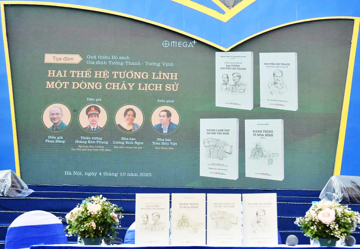 Trong khuôn khổ chuỗi hoạt động, chiều 4/10, tại vườn hoa đền Bà Kiệu (khu vực phố đi bộ, hồ Hoàn Kiếm) đông đảo bạn đọc đã đến buổi tọa đàm “Hai thế hệ tướng lĩnh - Một dòng chảy lịch sử”. Bộ sách “Gia đình Tướng Thanh - Tướng Vịnh” gồm 4 cuốn: Hành trình vì hòa bình, Những câu chuyện về Đại tướng Nguyễn Chí Thanh, Những cánh thư ra Bắc vào Nam và Nguyễn Chí Thanh - Những góc nhìn từ hậu thế, do Công ty Sách Omega+ phối hợp NXB Quân đội nhân dân phát hành.