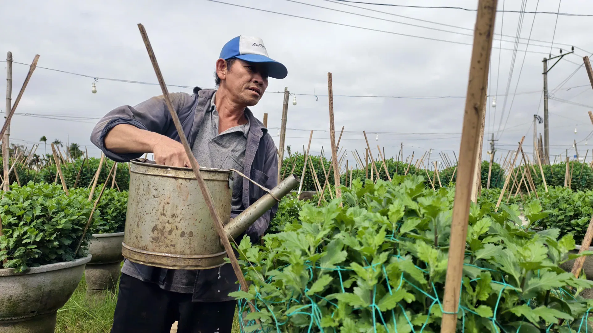 Ông Lê Văn Nông nỗ lực chăm sóc các chậu cúc sau chuỗi ngày dài bị ảnh hưởng bởi thời tiết bất lợi.