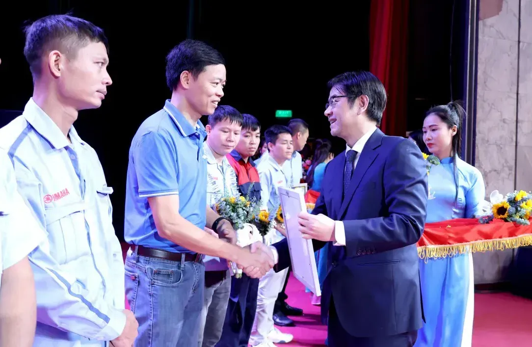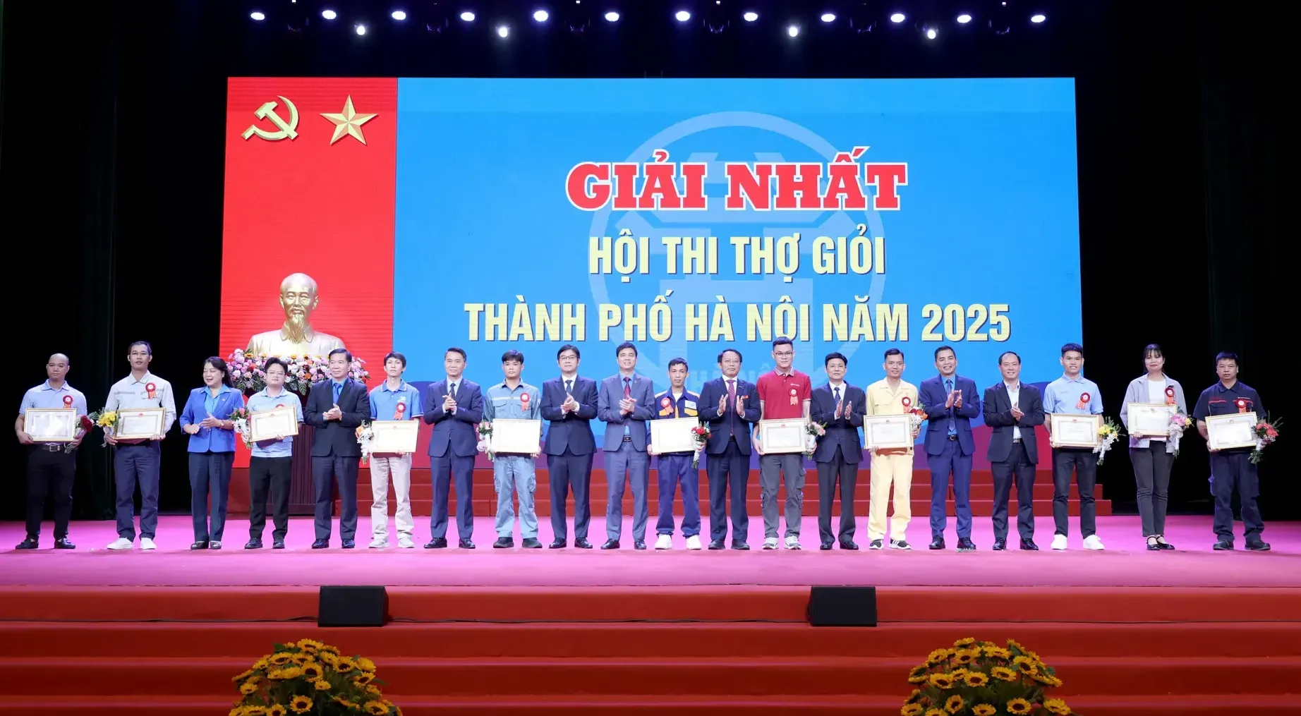 Các đại biểu trao giải cho thí sinh giành giải Nhất hội thi thợ giỏi TP năm 2025. Ảnh: Mai Quý