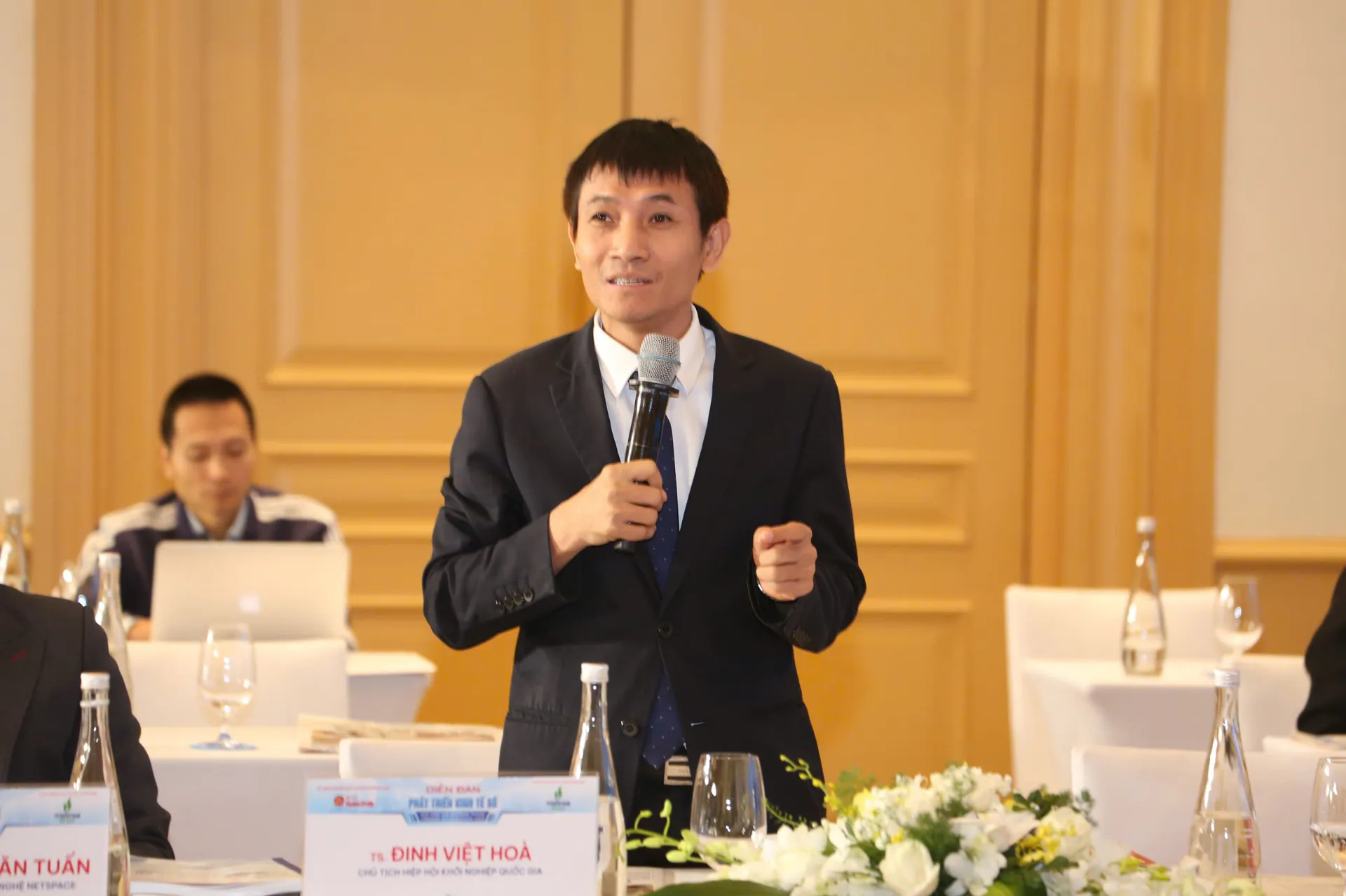 TS Đinh Việt Hòa – Chủ tịch Hiệp hội Khởi nghiệp Quốc gia chia sẻ tại diễn đàn. Ảnh: Phạm Hùng